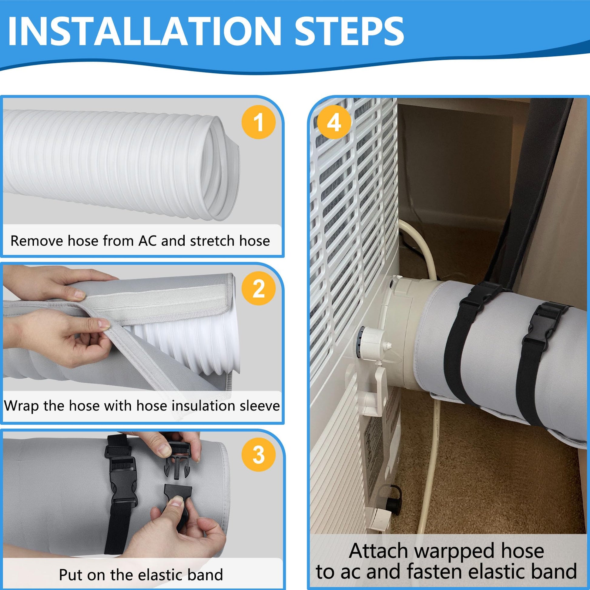 - 【EASY INSTALLATION】Just take a few mins to put this sleeve on your portable air conditioner hose. Please follow this instruction: 1. Remove hose from portable AC and stretch hose. 2. Wrap the hose with hose insulation sleeve through magic velcro. 3. Put the elastic band on both ends. 4. Attach warpped hose to ac and fasten with elastic buckle band.