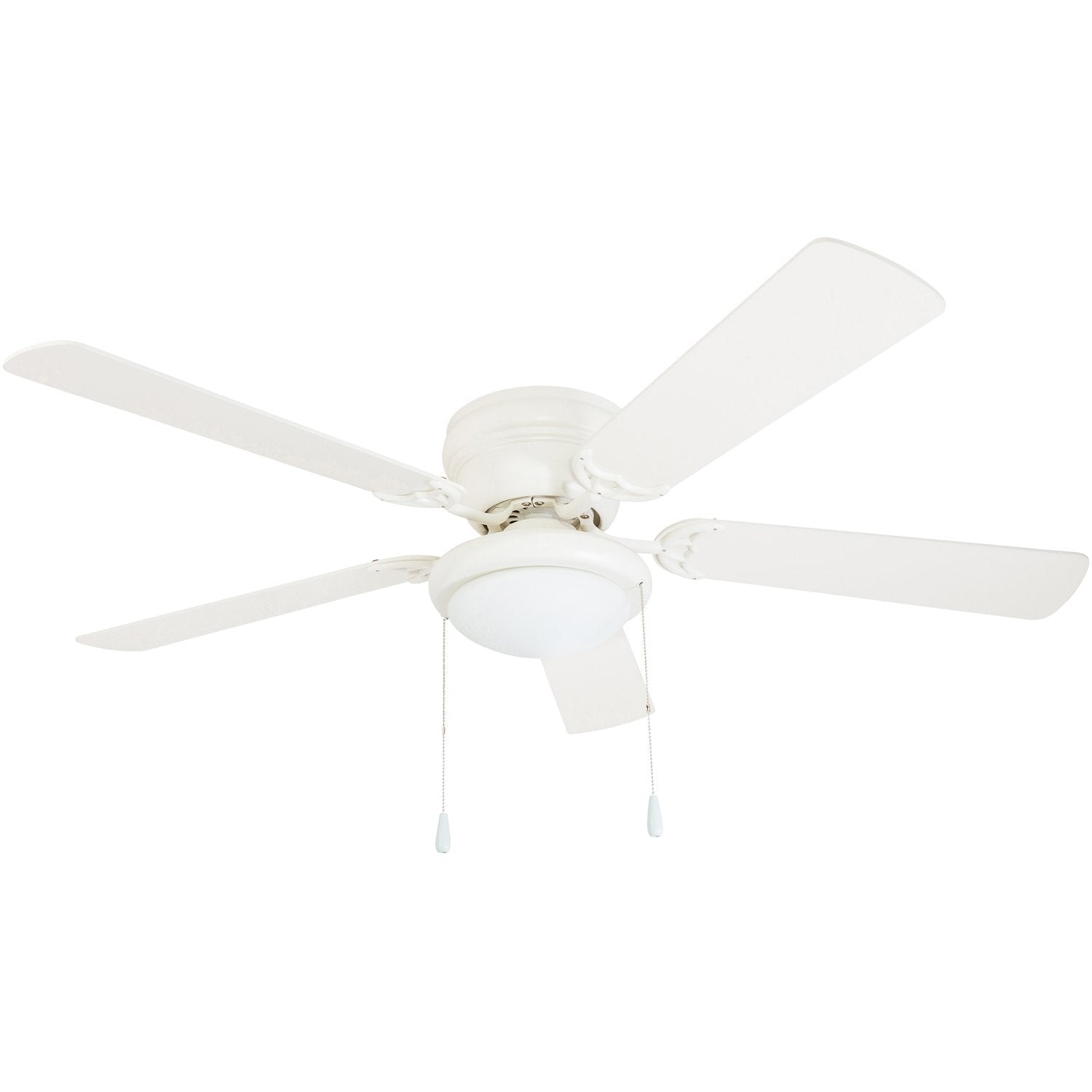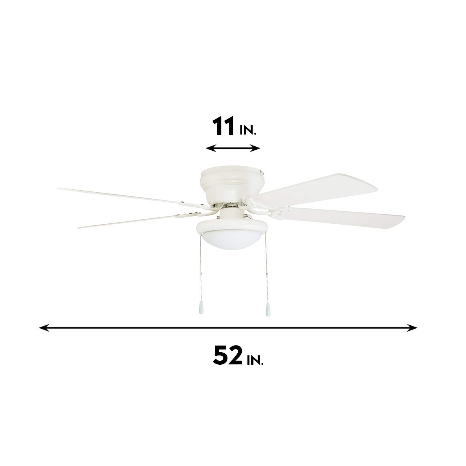 Details: This Portage Bay indoor ceiling fan uses this low-profile 52 inch hugger style ceiling fan for flush-mount installations where ceiling height is of concern.With a high-performance motor for powerful, yet quiet operation this indoor ceiling fan incldues a reversible motor for summer and winter mode. This ceiling fan is ideal for most interior rooms up to 20 ft. X 20 ft. Led bulbs included also compatible with CFL bulbs.