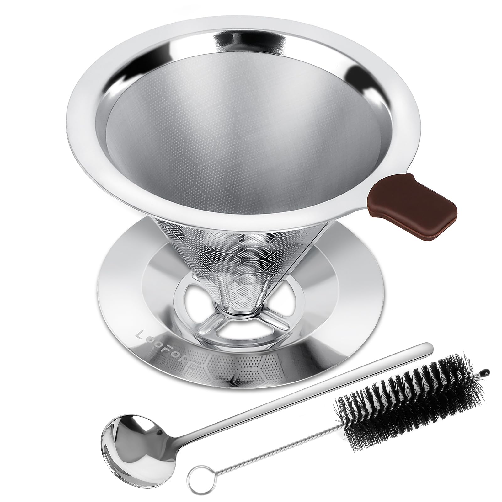 Pour Over Coffee Dripper, LOOFORE Stainless Steel Coffee Filter, Metal Cone Filter Paperless Reusable Coffee Filter Single Cup Coffee Maker 1-2 Cup, with Spoon and Silicone Tray, Cleaning Brush