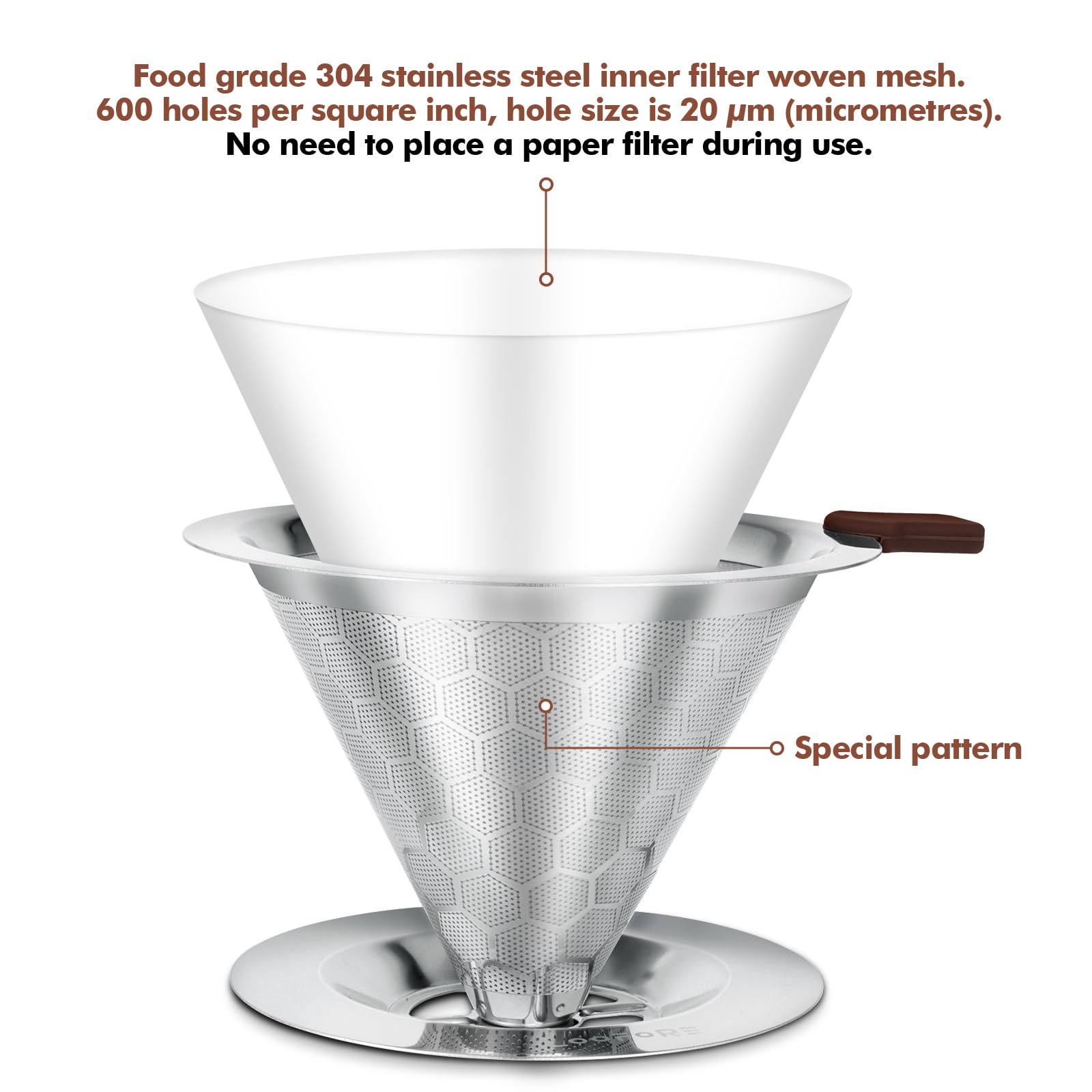 - Double Mesh Design: The coffee filter is made of 304 food-grade stainless steel without using paper filters. The bottom is integrated with the filter element, solid and not break. The dual coffee dripper brewing design prevents any coffee grounds from passing, no grounds end up in your cup.