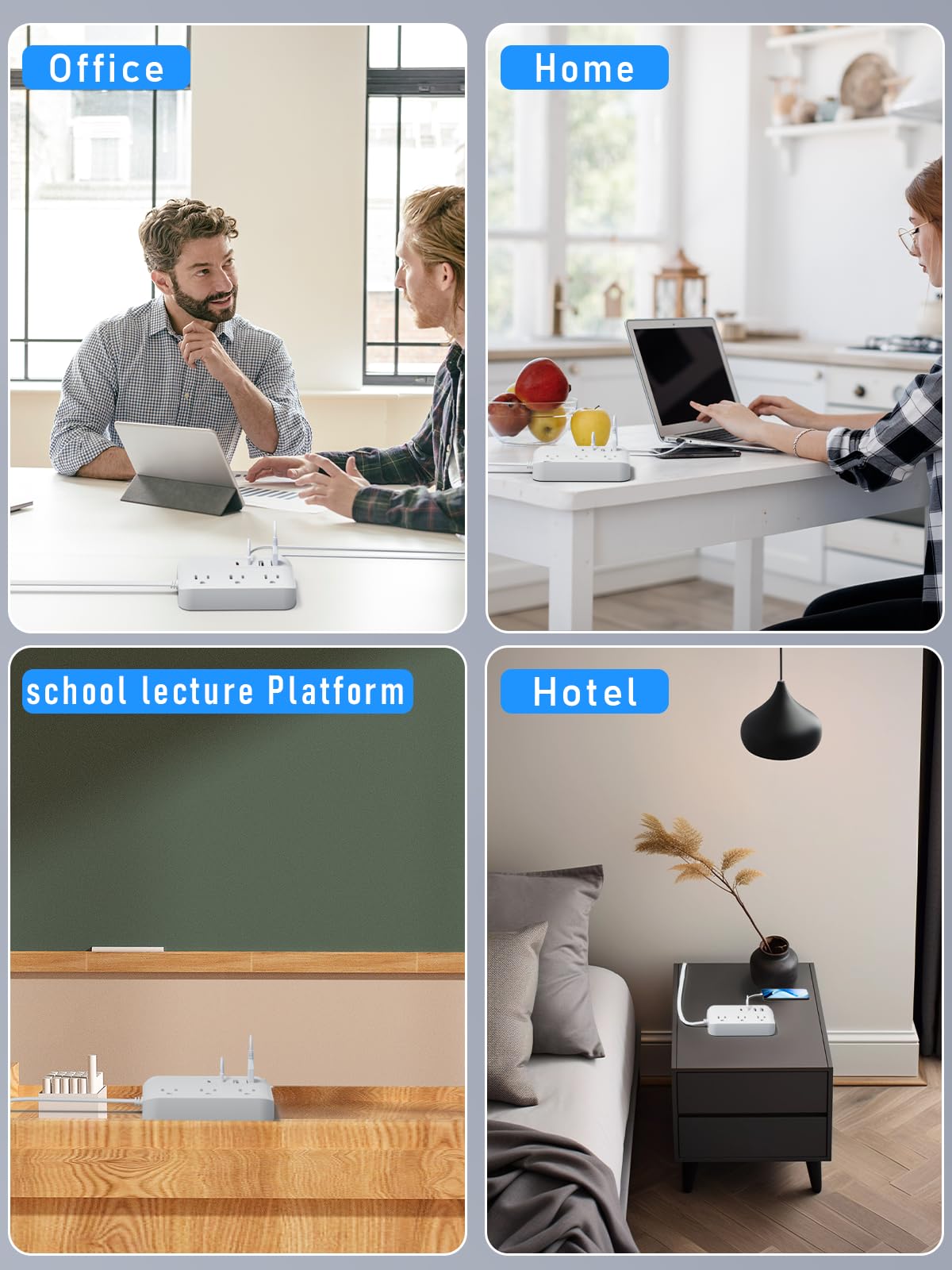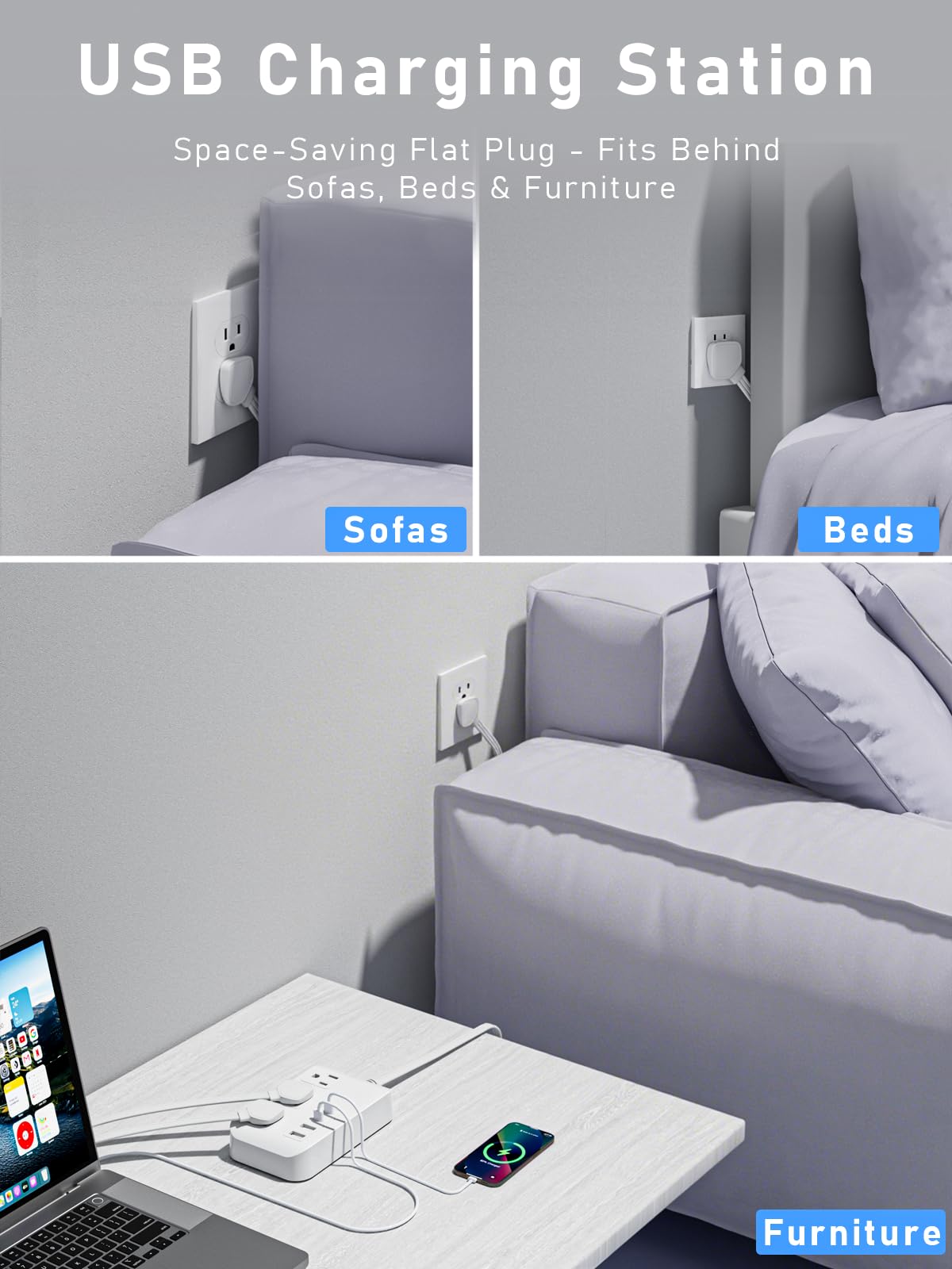 - 【7-in-1 Power Strip with USB Ports】 –Extension cord flat wall plug features 3 AC outlets (125V/10A, 1250W max) and 4 USB ports (2 USB-A + 2 USB-C). Charge up to 7 devices simultaneously—perfect for phones, laptops, tablets, cameras, and more at home, office, or dorm