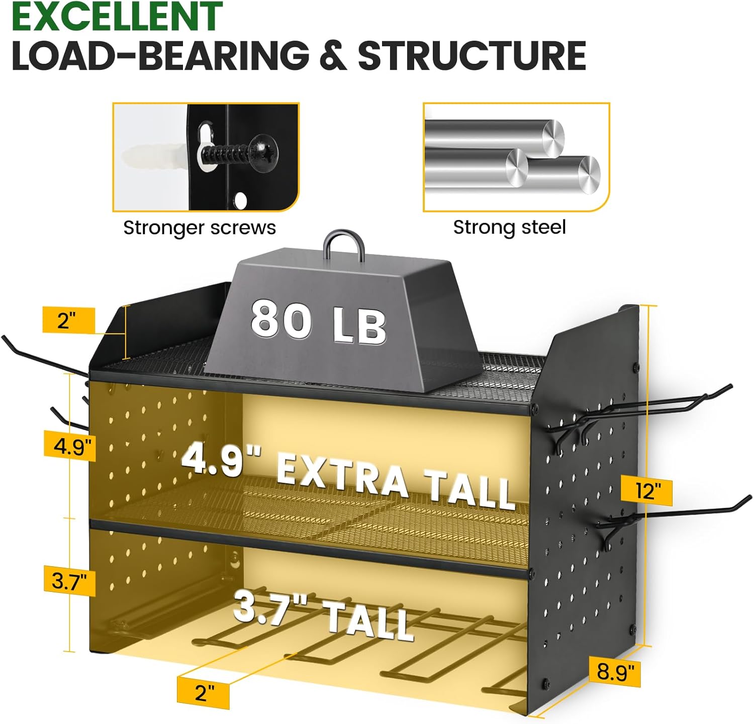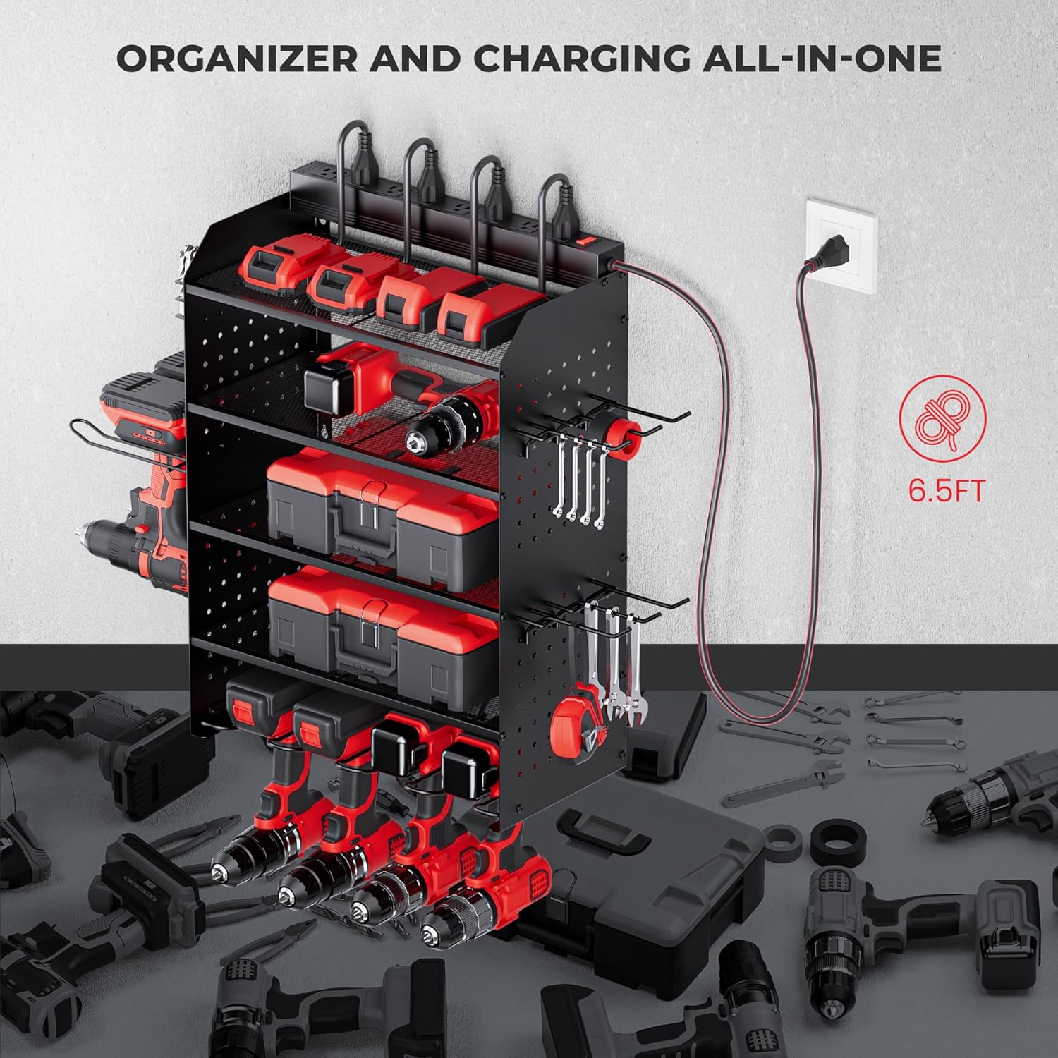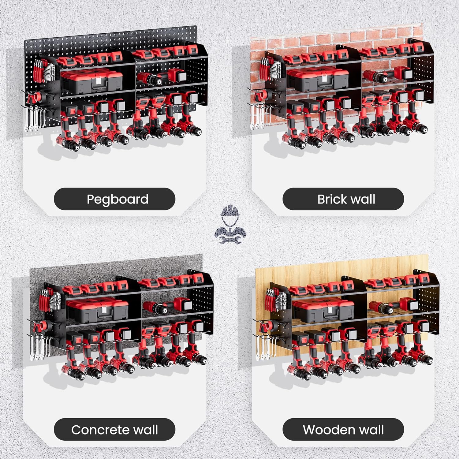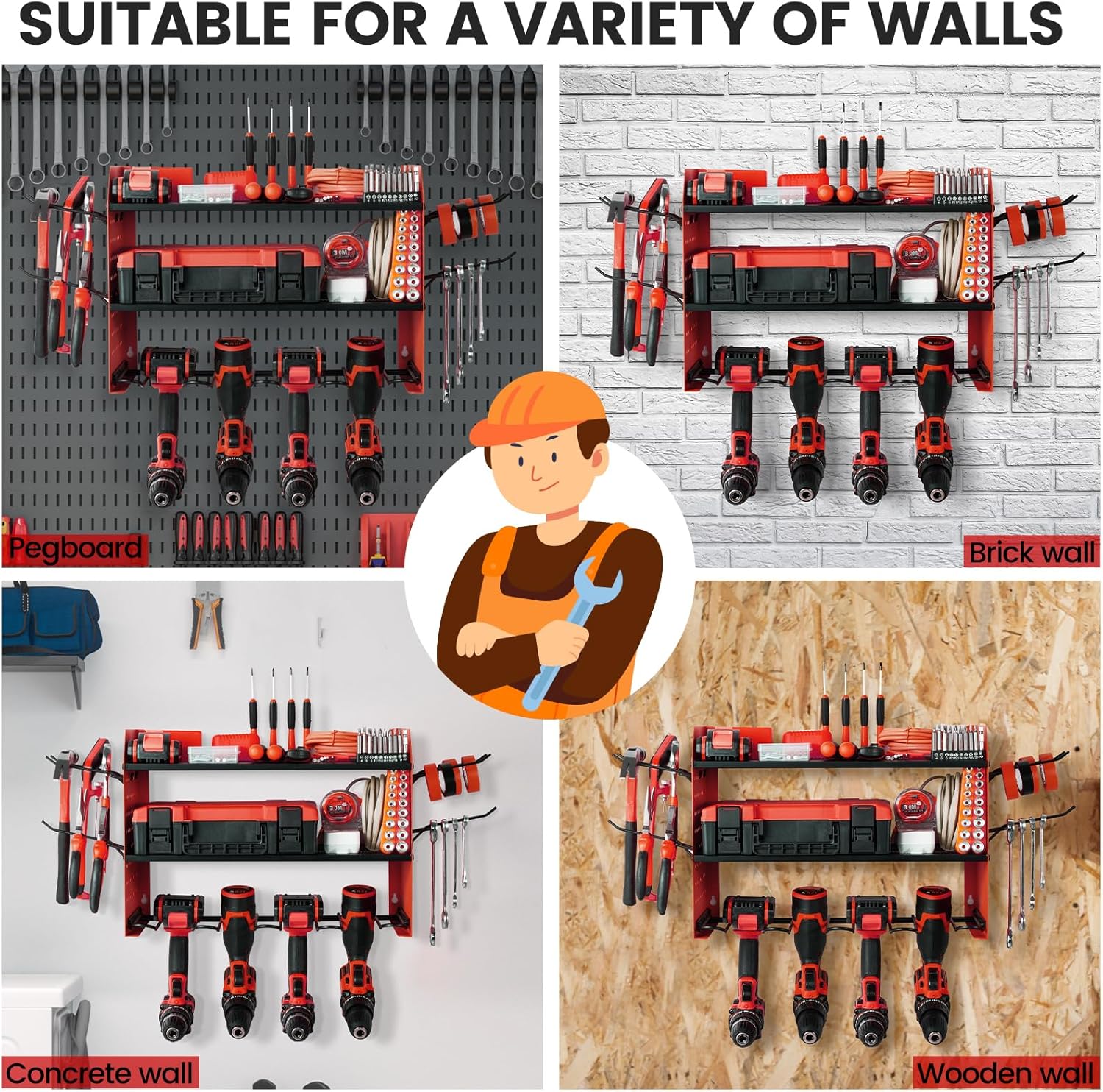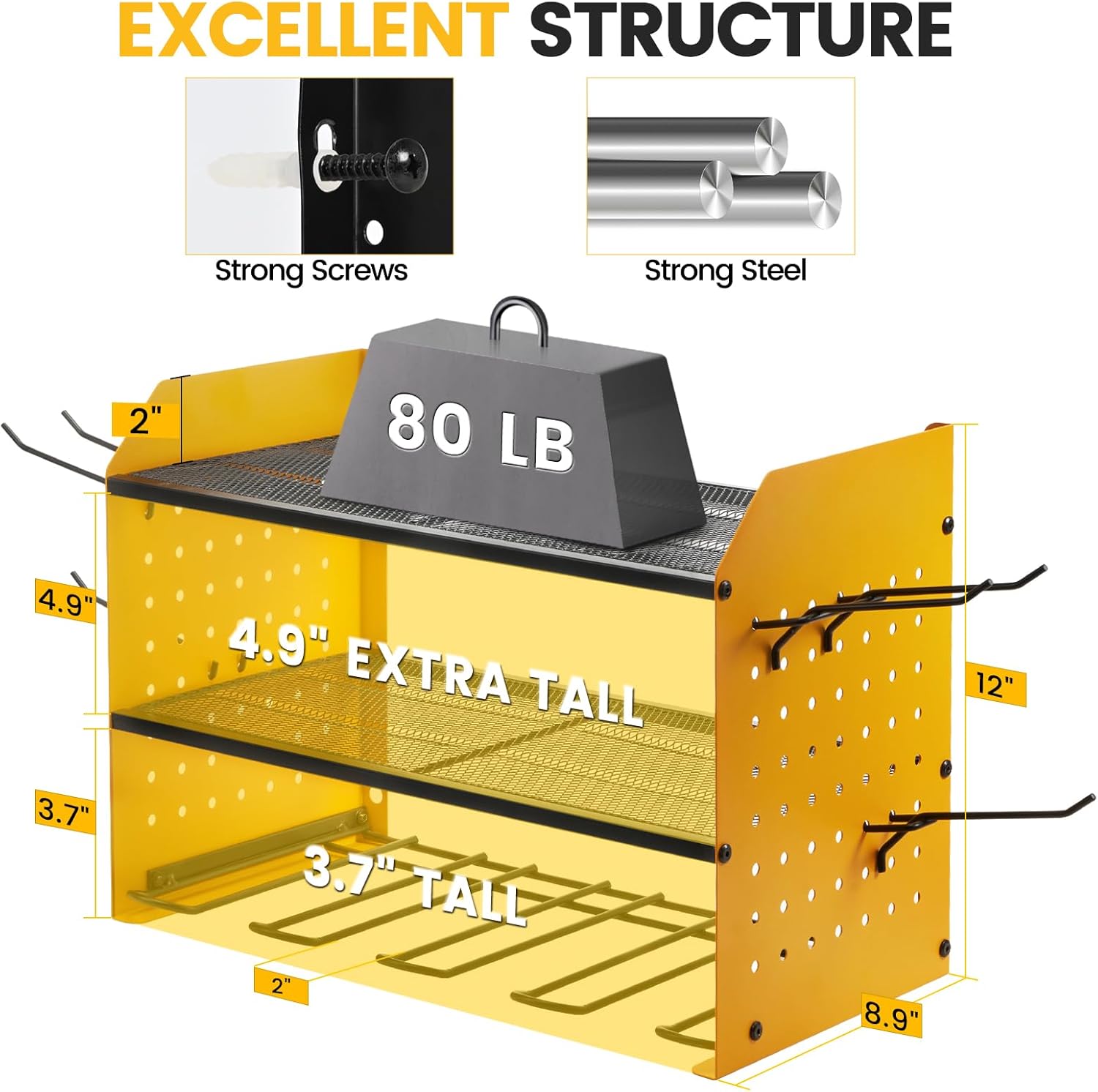 - 3-Layer Efficient Storage: First layer for rechargeable tool organization, second layer with extra height (4.9") for garage tools, bottom layer for 4 cordless drills, side pegboards include drill bit rack, 4 long hooks, and drill rack for 2 drills