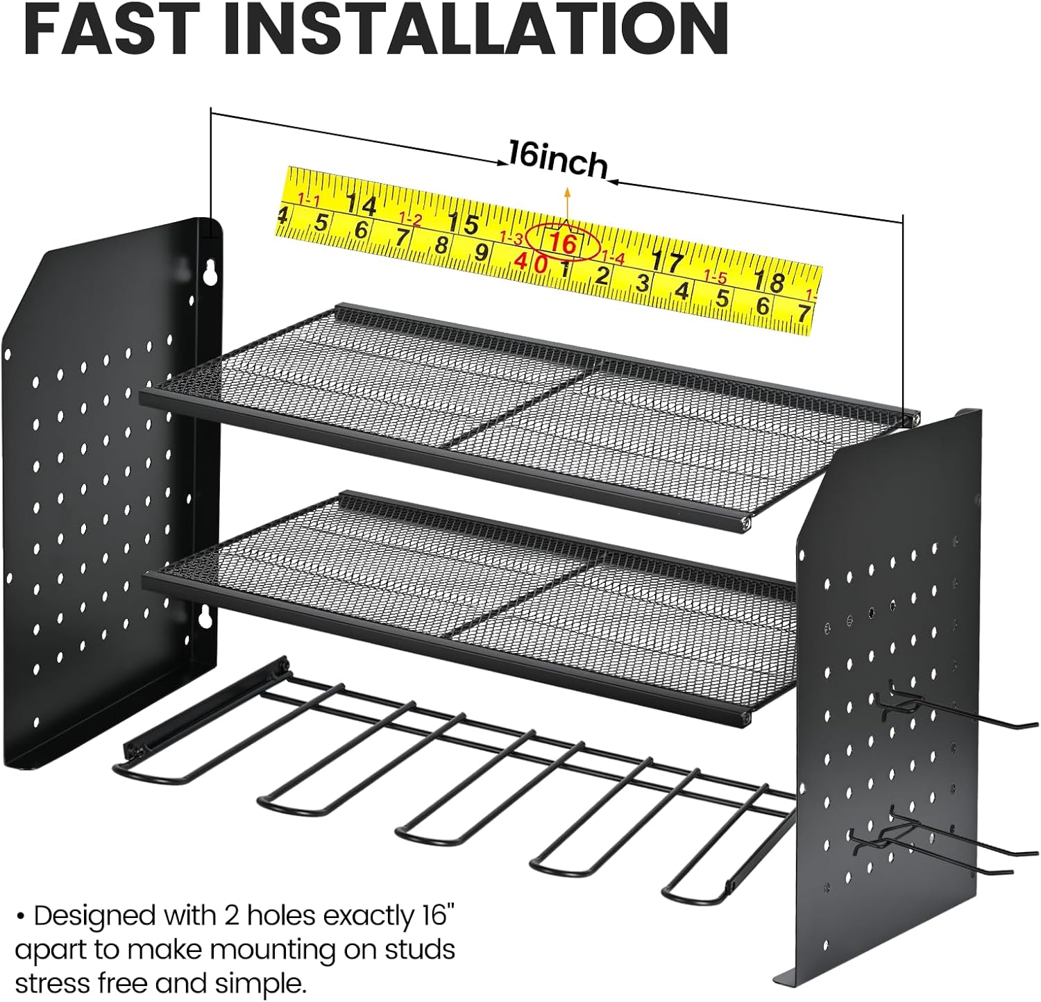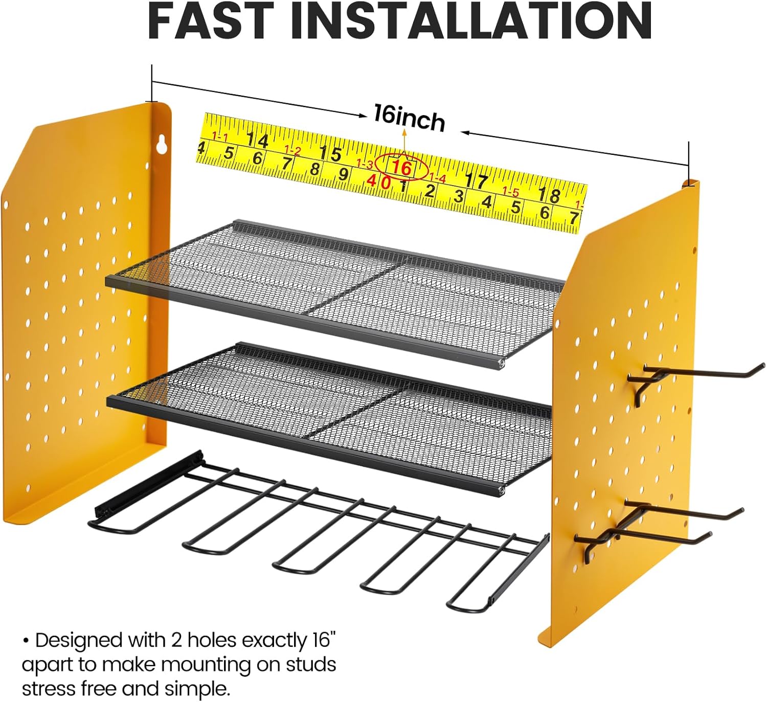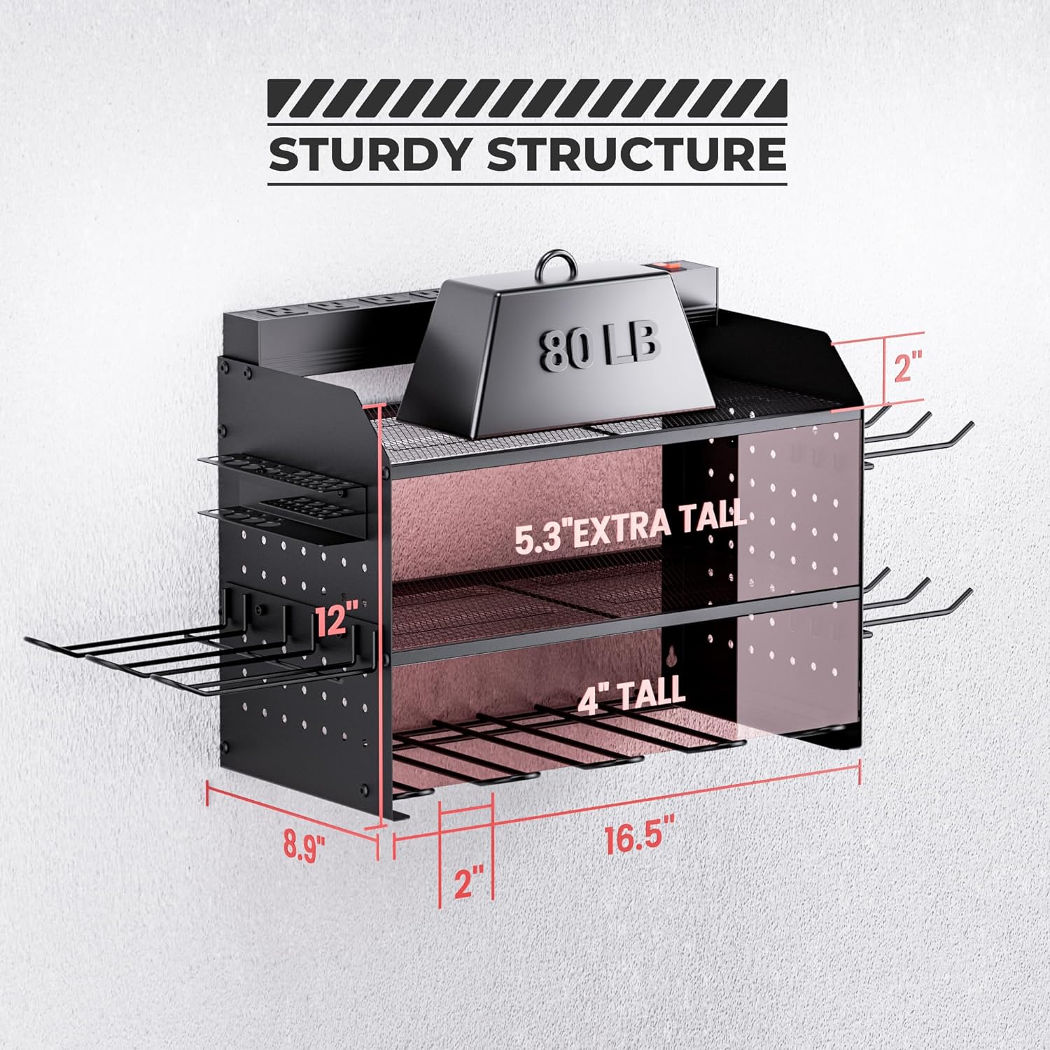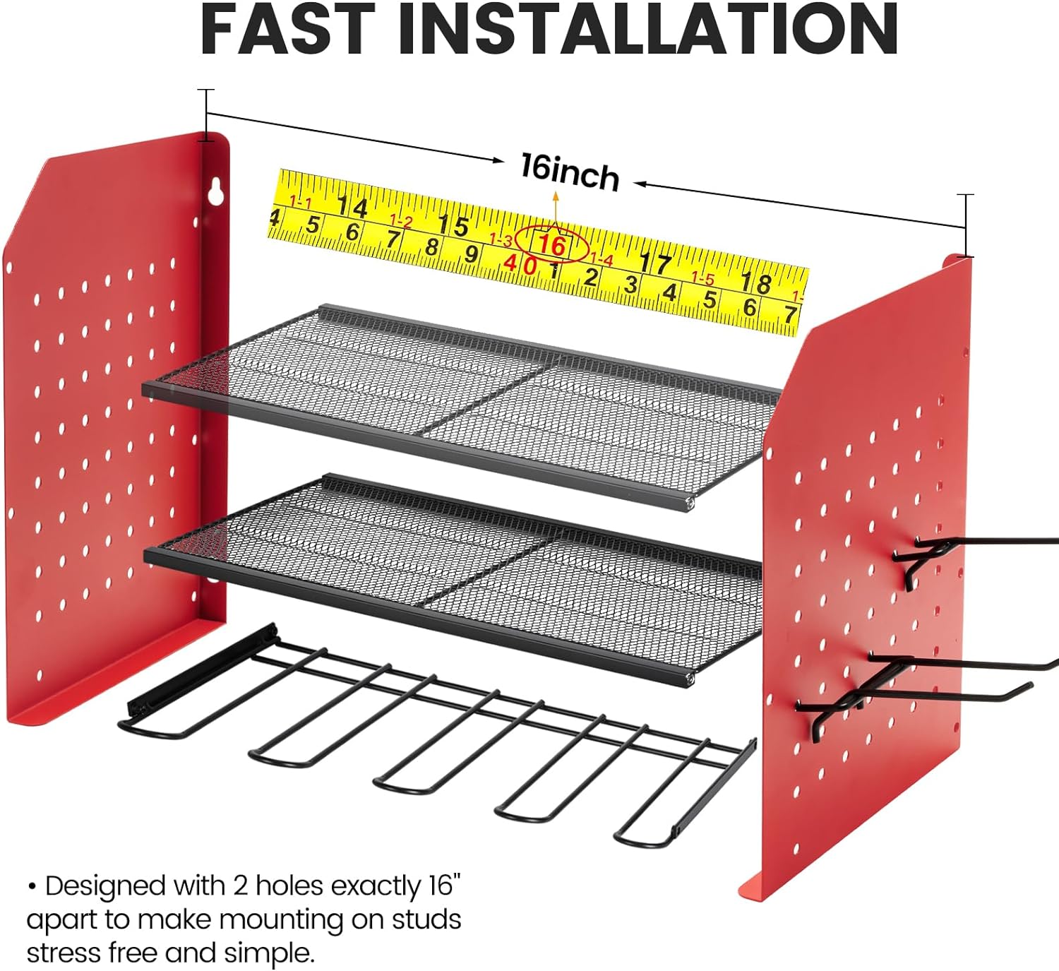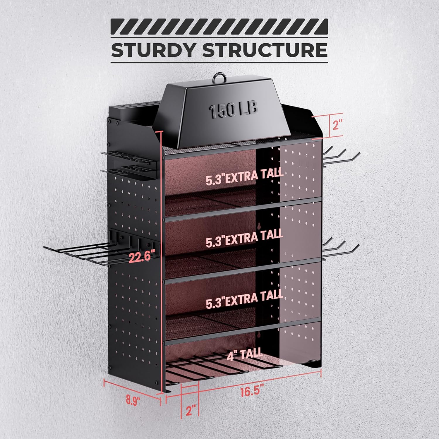 - 3-Layer Efficient Storage: First layer for rechargeable tool organization, second layer with extra height (4.9") for garage tools, bottom layer for 4 cordless drills, side pegboards include drill bit rack, 4 long hooks, and drill rack for 2 drills