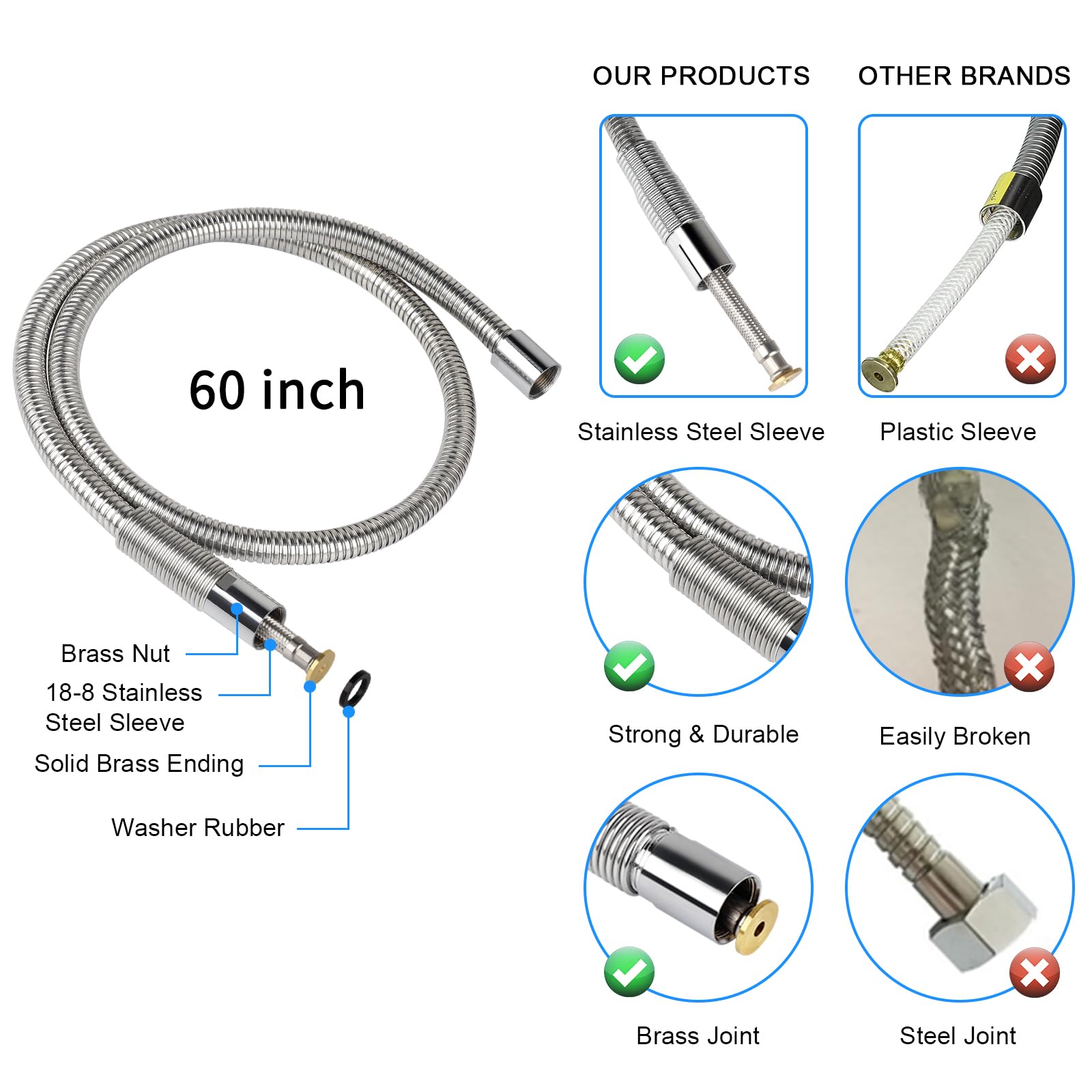 - [Commercial Sink Hose Size] - The ultra-long 60 inch hose allows you to reach anywhere to the sink and easily clean each corner. It is made from stainless steel, lead-free material, and the flexible pipe is resistant to oxidation and corrosion. The spray hose on both sides thread is a Female 7/8 inch-20NPT inlet, the connector with rotatable parts so that the hose will not twine.