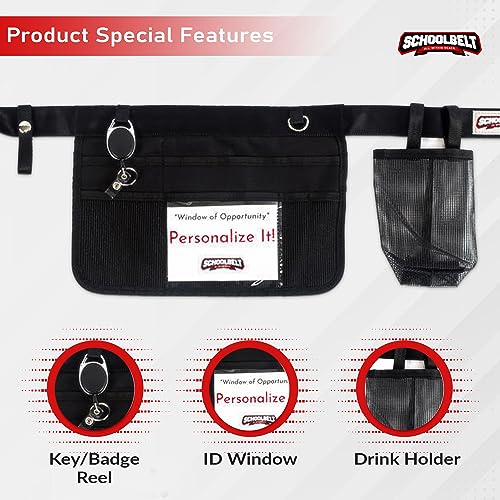 - BONUS PRACTICAL FEATURES: As if this utility apron with pockets was not exceptional enough, we added a RETRACTABLE BADGE REEL for keys, whistle and ID, a removable mesh DRINK POUCH, a SNAP LOOP for hanging items, and a STAINLESS RING to hang the loaded apron safely when not in use; Armed with additional details, our teacher apron with pockets is ideal for any school or mobile worker!