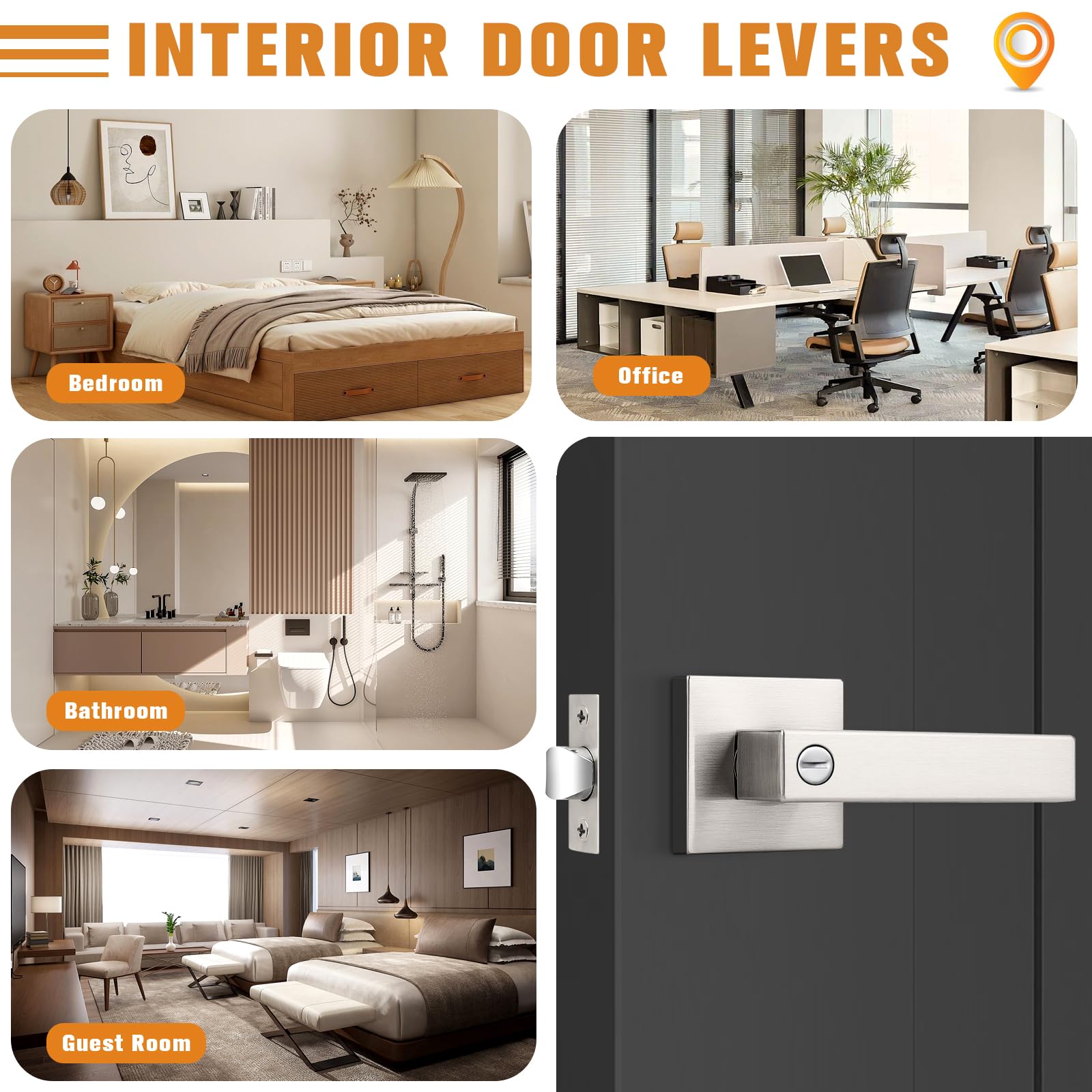 Probrico Interior Brushed Nickel Door Handle, Heavy Duty, Flat Square Privacy Door Handles, Keyless Door Levers Lockset for Bedroom and Bathroom (4 Pack, Modern)