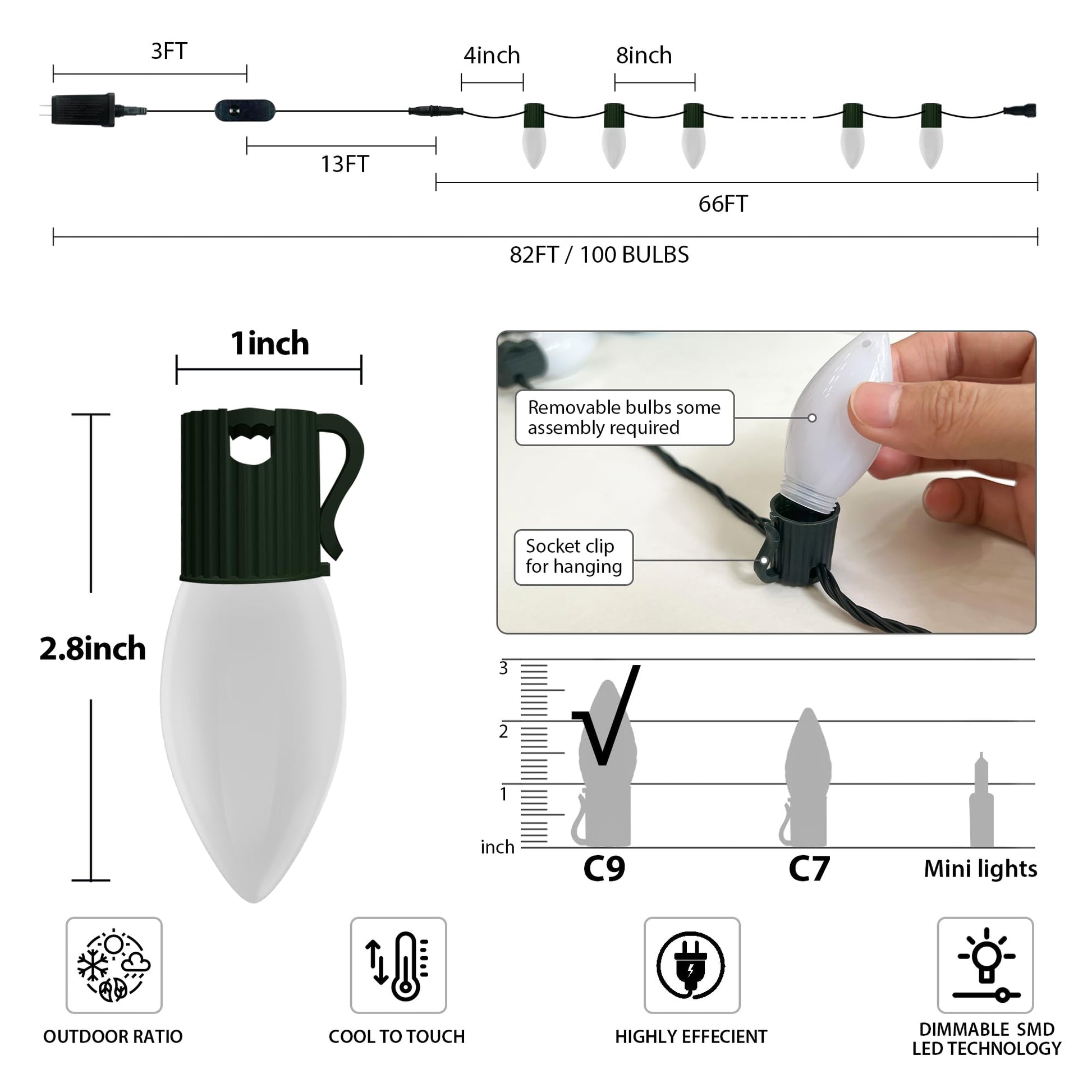 - Durable & Waterproof for Outdoor Use: With IP65 waterproof rating, these C9 LED Christmas Lights withstand snow, rain, and wind. Perfect for year-round use in patios, gardens, and roof Christmas lights without worrying about weather conditions.