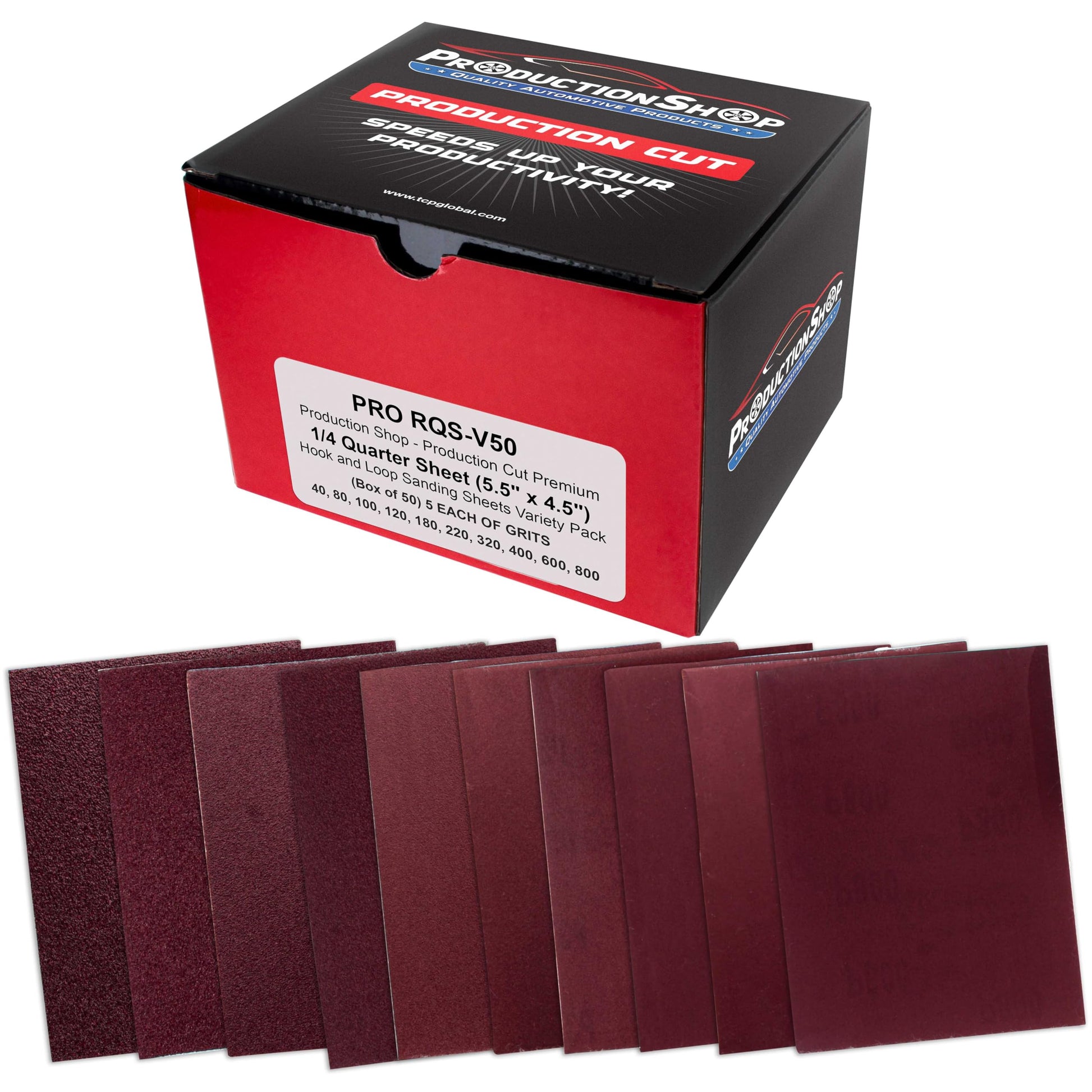 - Full Range of Sanding Grits: These premium 1/4 sheet size sanding sheets are available in variety packs with multiple grits and separately in a full range of sanding grit grades from coarse to very fine: 40, 60, 80, 100, 120, 150, 180, 220, 320, 400, 600, and 800. ProductionShopoffers a professional product line of high-quality sandpaper types that provide exceptional sanding performance, allowing you to get the job done fast, saving you time and money!