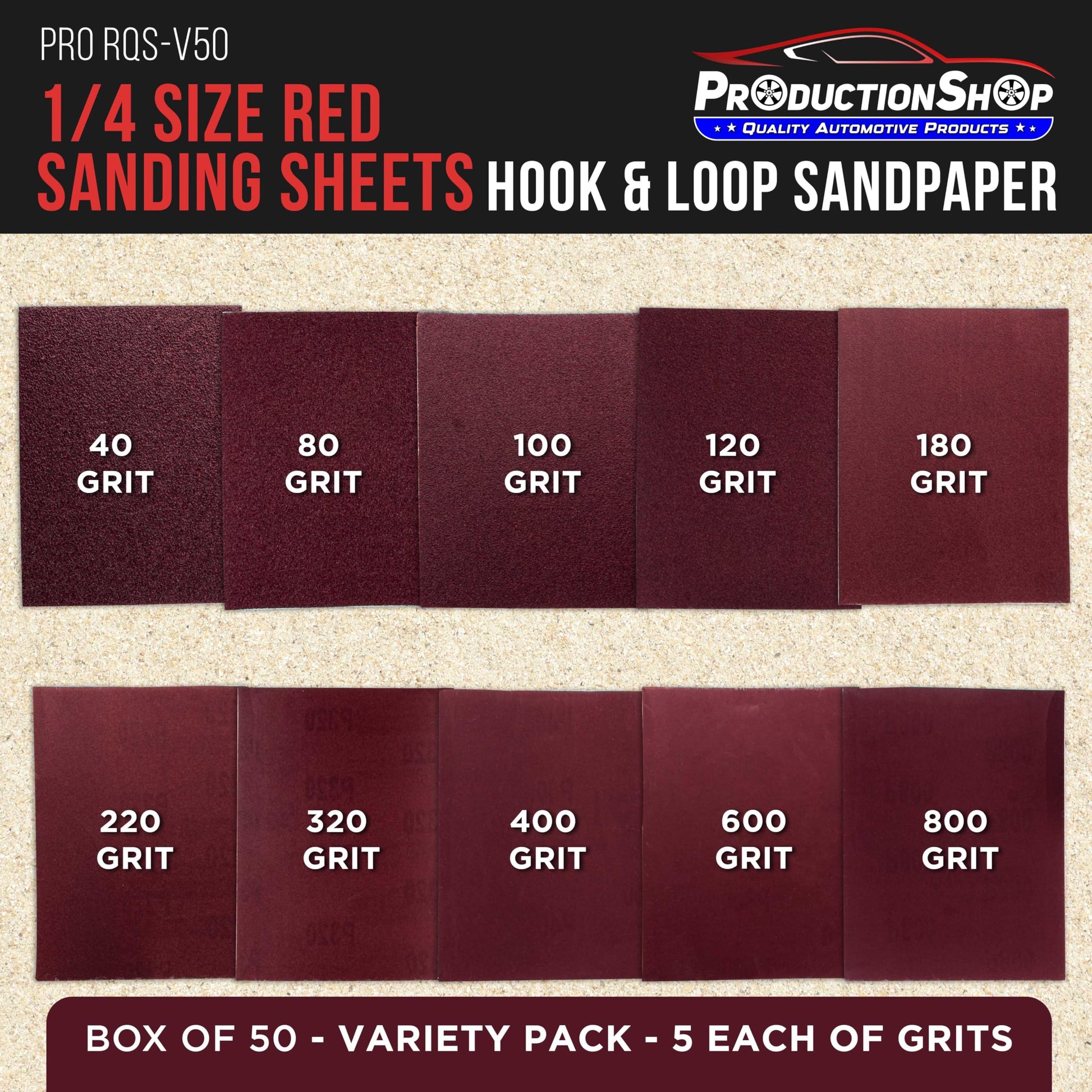 - 10 Grit Variety Pack Box of 50 ProductionShopPremium 1/4 Sheet Size (4.5" x 5.5") Red Sanding Sheets with a Hook & Loop Backing. The sheet assortment includes 5 each of grits 40, 80, 100, 120, 180, 220, 320, 400, 600, and 800. These 1/4 sanding sheets have a hook & loop backing that securely attaches to palm, orbital, and finishing sanders or onto hand sanding blocks with hook & loop backing plates.