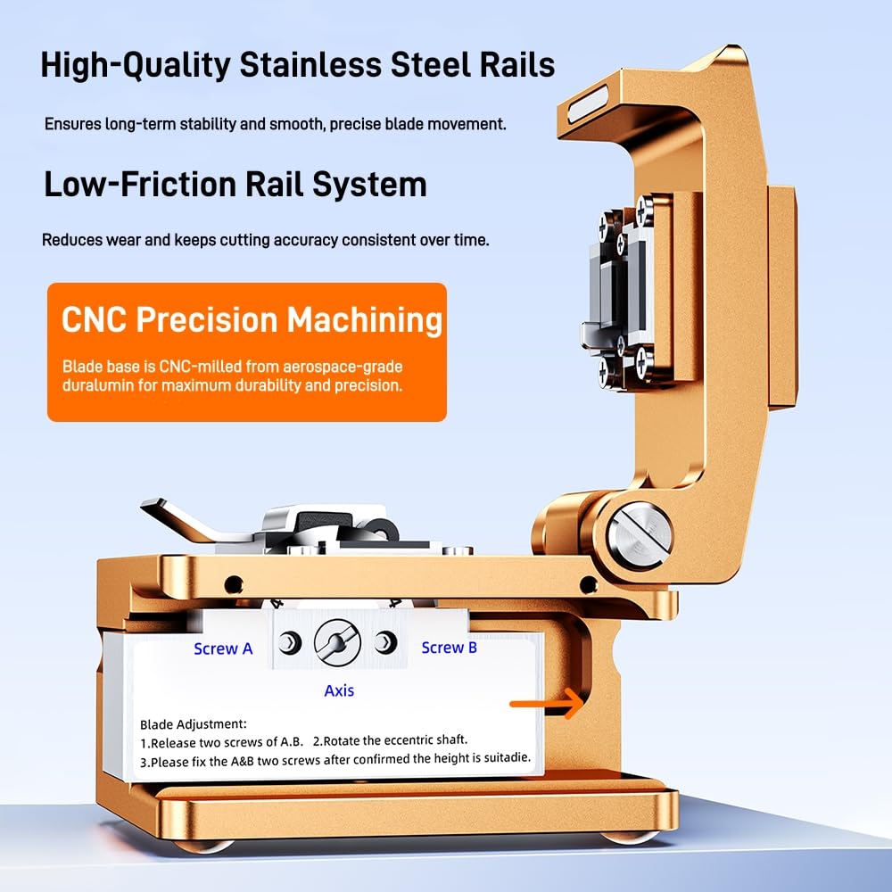- Ultra-Precise Cleaving Technology Engineered to deliver industry-leading <0.5° cutting angle accuracy, ensuring flawless fiber end-face preparation for seamless fusion splicing. Certified to meet IEC 61300-3-27 standards for telecom-grade performance.