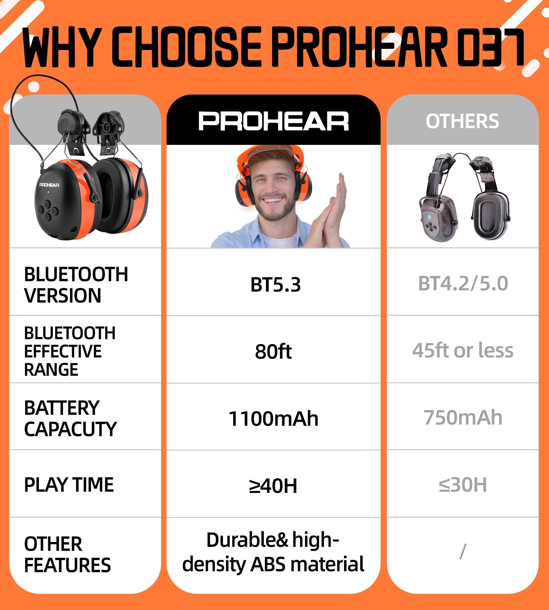 - EXTREMELY SMOOTH BLUETOOTH 5.3 TECHNOLOGY: The connection to the phone is smoother, faster and more stable. Bluetooth has a wider range, better sound quality and smarter mode, allowing you to move freely in your work environment, enjoy music and answer phone calls easily. PROHEAR Hearing Protector is engineered with the latest Bluetooth 5.0 technology that provides a more stable connection (wireless range 80ft) than Bluetooth 4.0. Never worry about losing the connection in your pocket