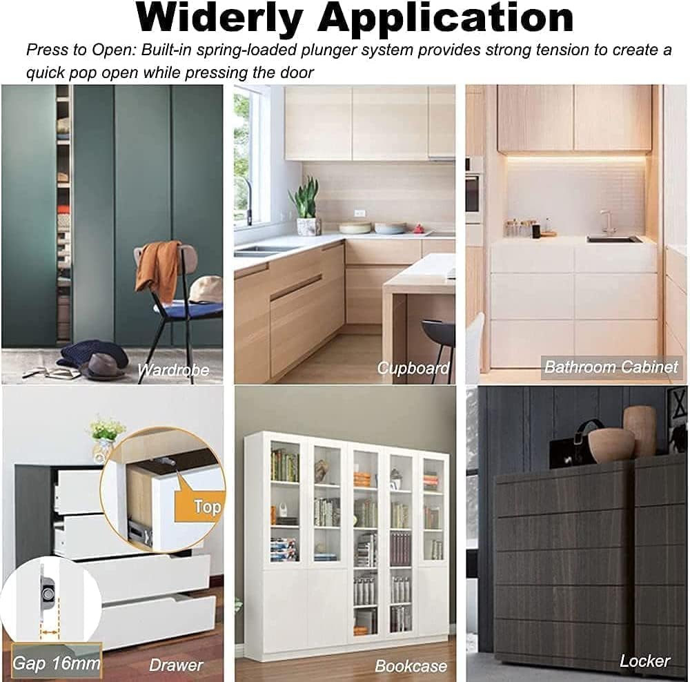 - Push to Open: No more knobs or handles needed! Our push to open system uses a spring-loaded plunger to create a quick pop open while pressing the door. Perfect for kitchen cabinets, drawers, cupboards, wardrobes, and dressers.