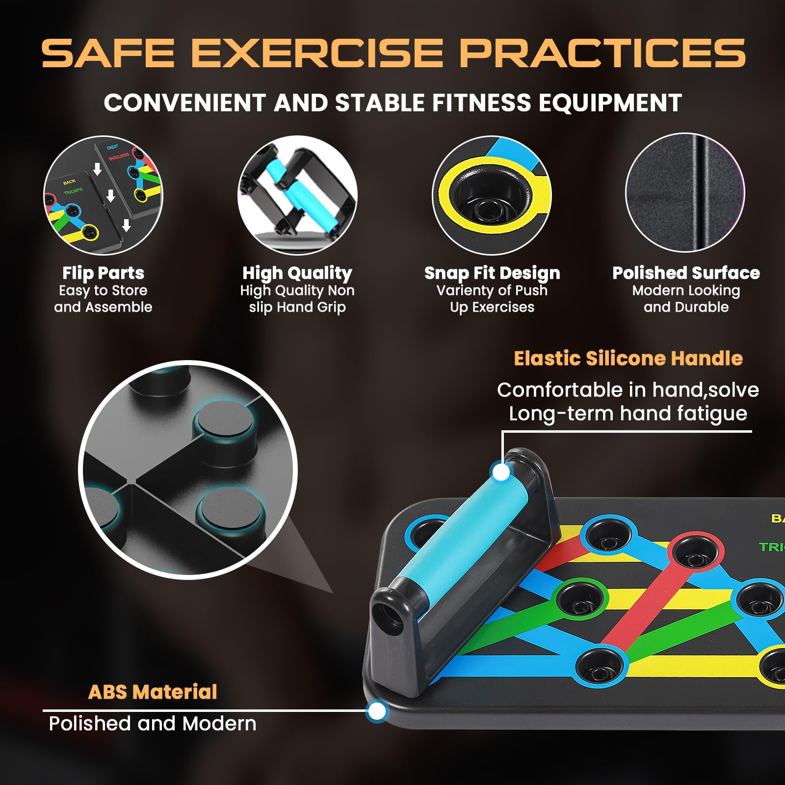 - PREMIUM QUALITY ABS MATERIAL: The push up board is crafted with high quality ABS plastic material which can bear heavy loads. You can achieve relax and comfort experience with these push up bars. The pushup handles are anti-slip which prevent from losing balance during exercise. The push up handles for floor has strong hand grips and multiple non-slips plugs which prevent from any injury or muscle damaging during workout.
