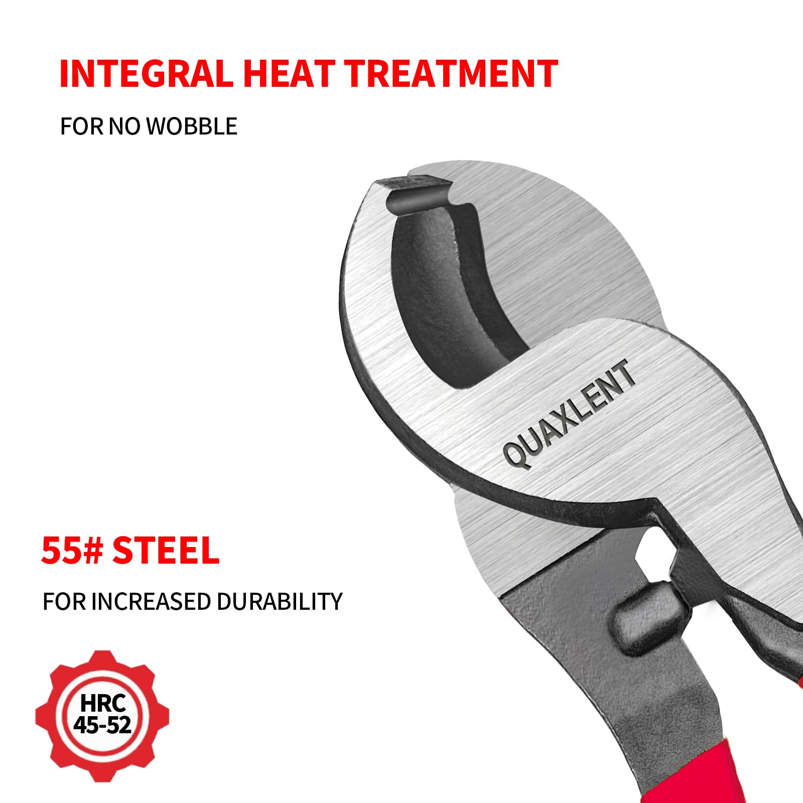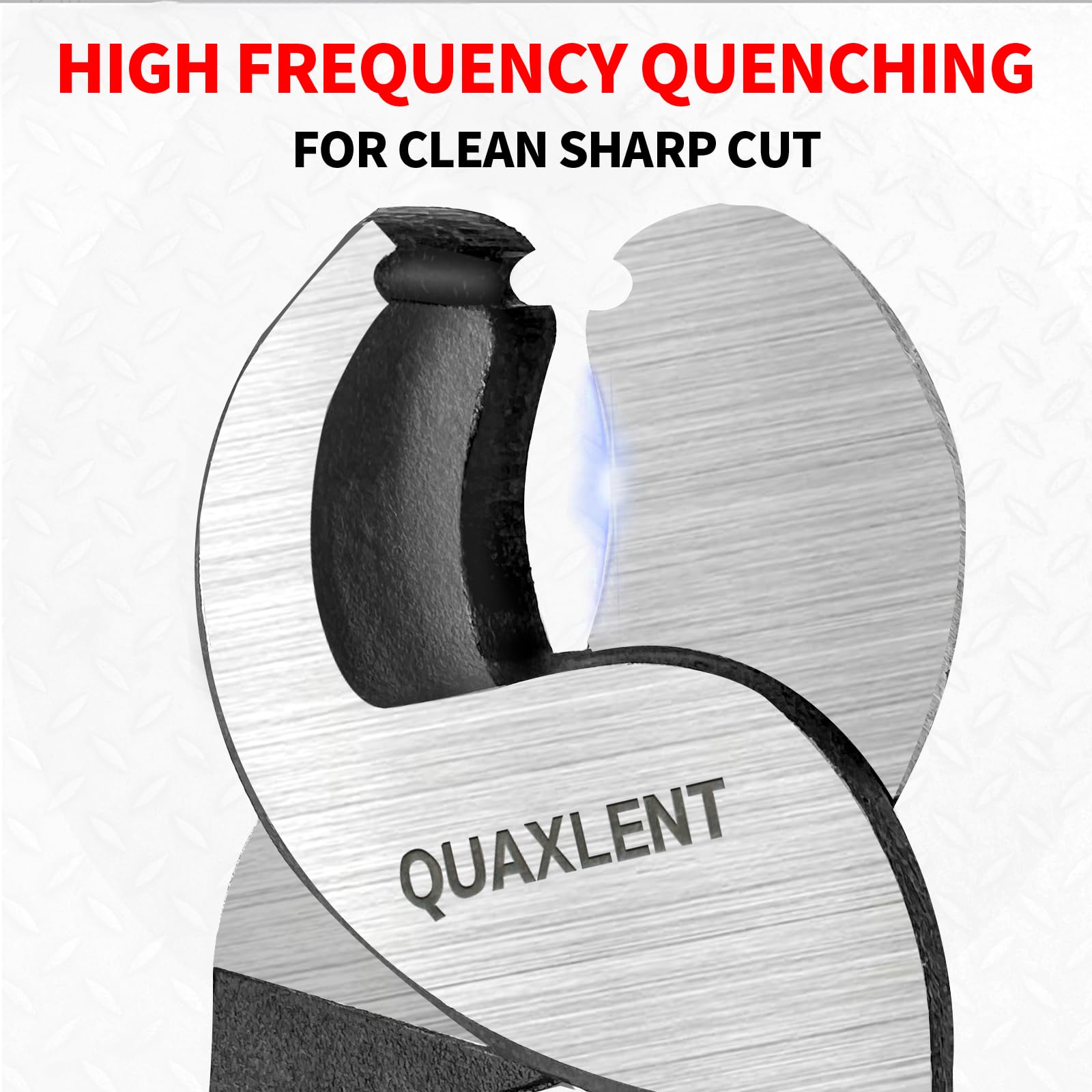 - Cut Like Butter: QUAXLENT wire cutter heavy duty is made of 55# steel, with a thickened body to strengthen the torque. After fine grinding and surface polishing, the cutting edge is neat and burr-free, beautiful and not easy to rust. The overall heat treatment improves the stability of the cable cutter during use and no wobble. The cutting edge adopts high-frequency quenching process, with higher hardness and sharp shear, realizing clean and sharp cutting. The hardness is up to HRC45-52 and extends the service life.