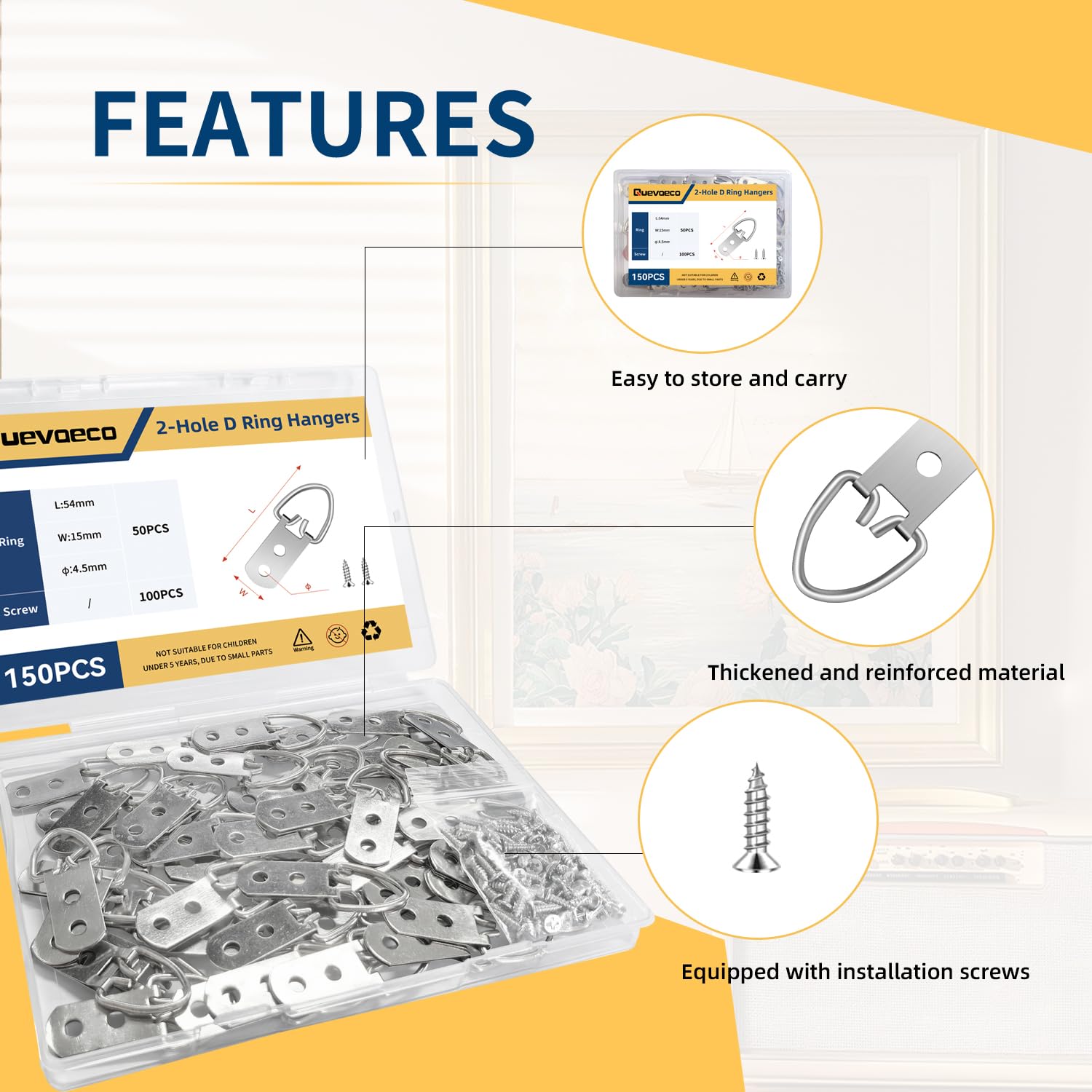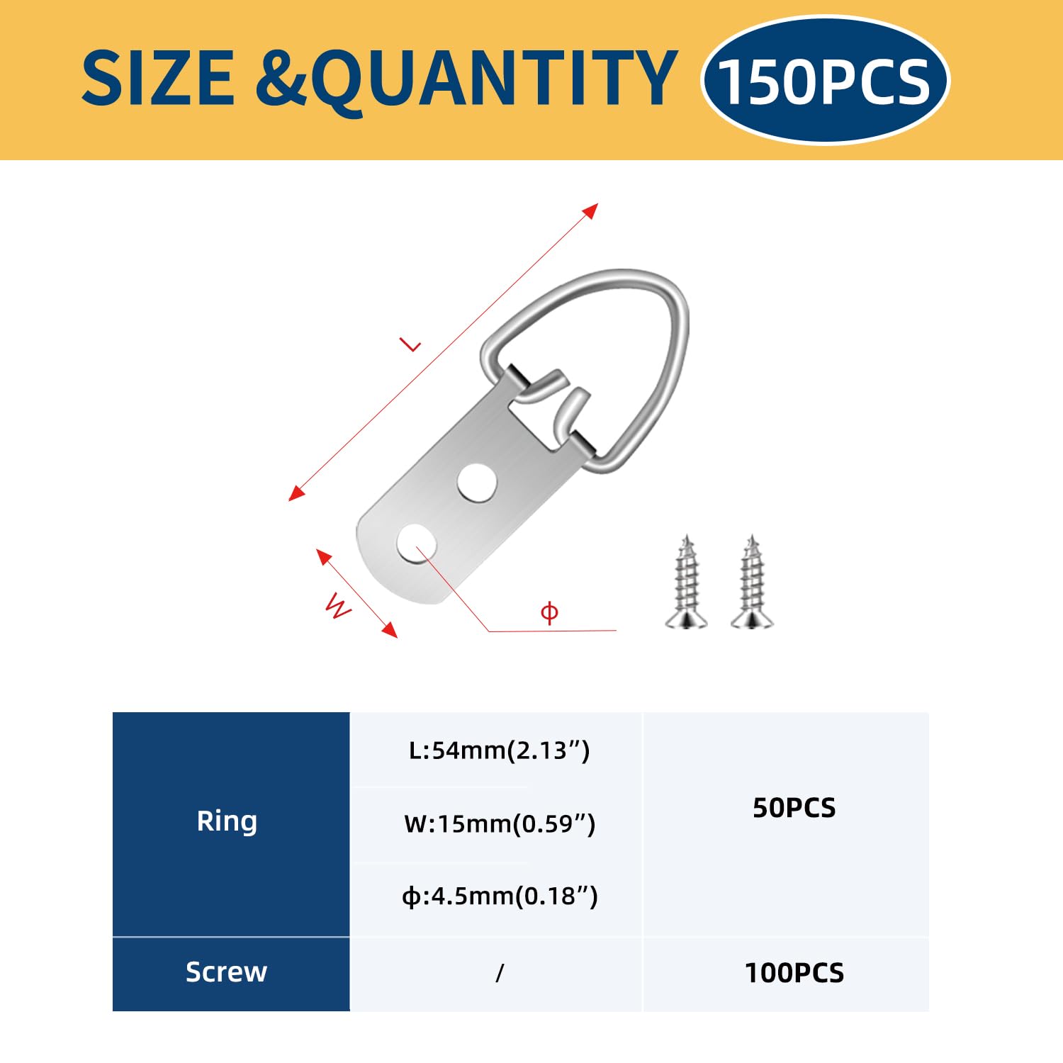 - Includes 50PCS D-ring frame hangers and 100PCS screws—an assorted hardware set for picture hanging d rings, triangle hooks, and frame hooks. A convenient variety pack for home, office, or gallery picture framing supplies.