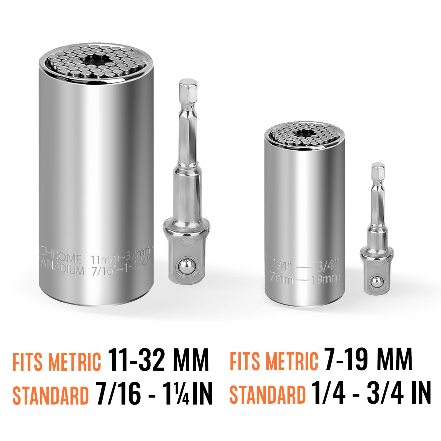 - All-in-One Universal Socket Set (4PCS): Includes two self-adjusting universal sockets (7–19mm & 11–32mm) plus two power drill adapters. Each RAK socket wrench set features innovative design with 54 super-strong steel rods, covering a wide range of bolts, nuts, hooks, and fasteners.