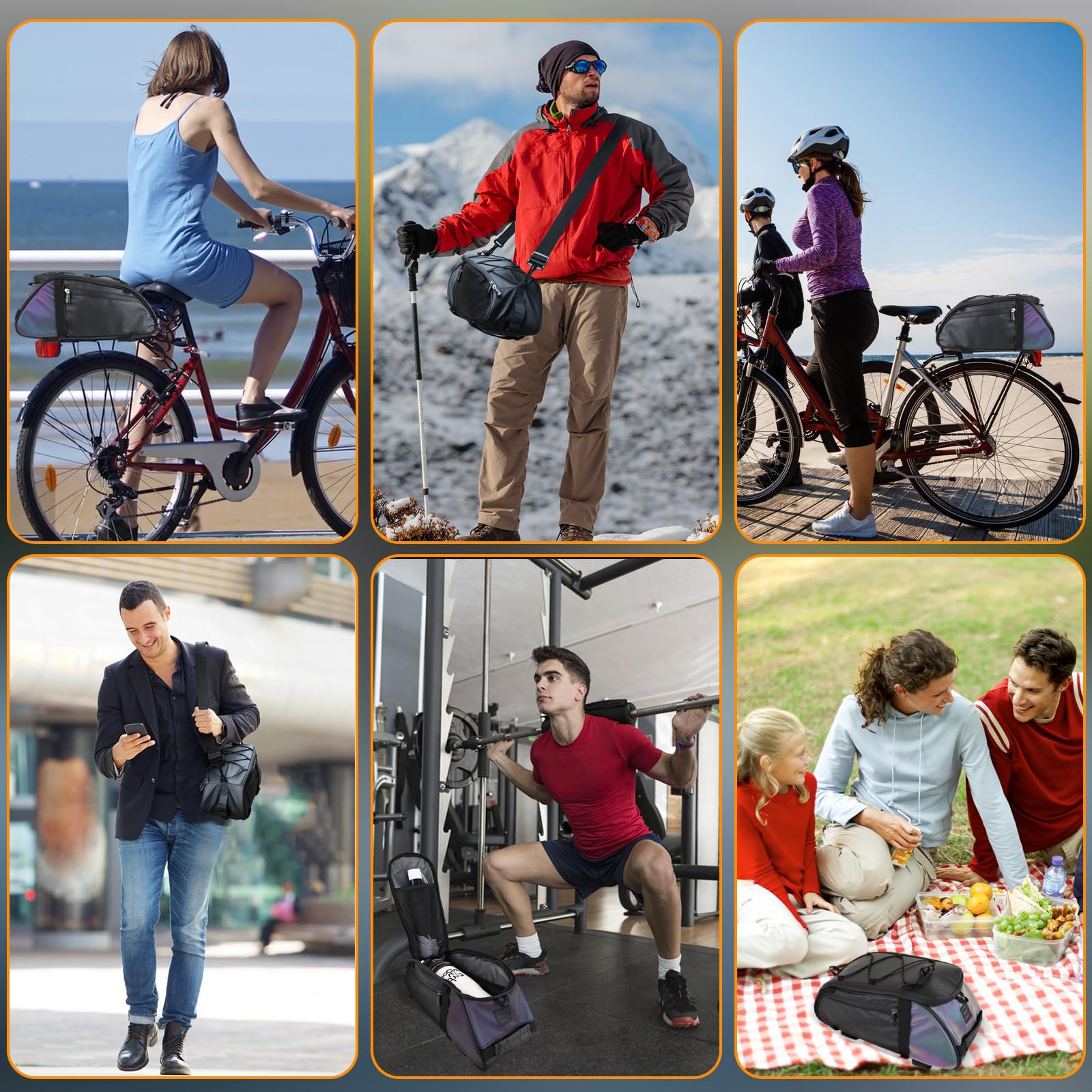 - 【Large capacity】Main compartment capacity of this bike rack bag is 10L,15.7''x6.7''x7.1'', which can store mobile phones, towels, clothes, water bottles, maps, mobile power supplies, food, etc. The added single shoulder strap design bike bag can also be used as a backpack or handbag, suitable for outdoor cycling, exploration, camping and travel.