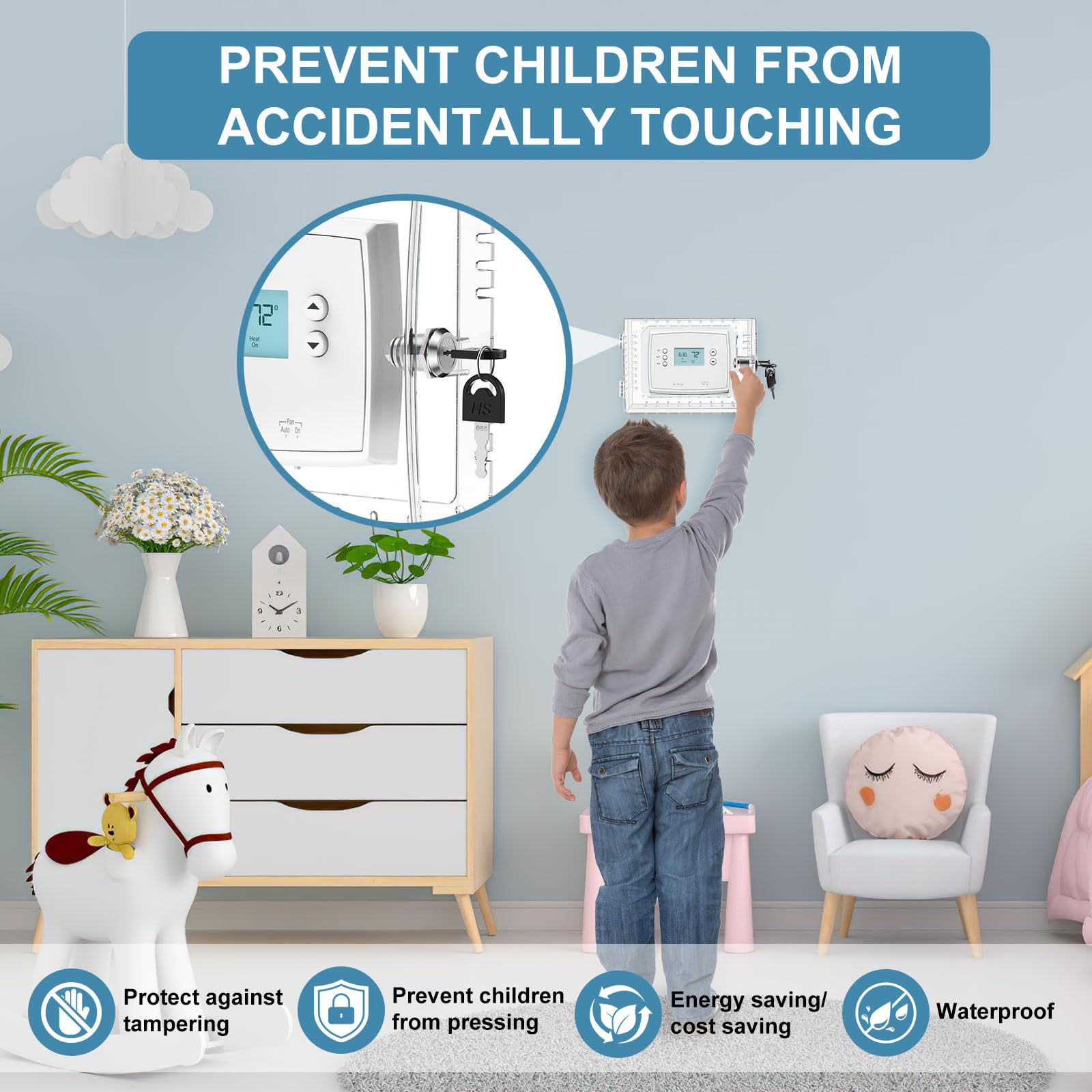 - PROTECTING THERMOSTAT SETTINGS: Thermostat cover with lock protects the thermostat from damage and tampering with thermostat settings by small children and unauthorized persons.Avoid large changes in indoor temperature affecting the fluctuation of electric meters and causing high costs