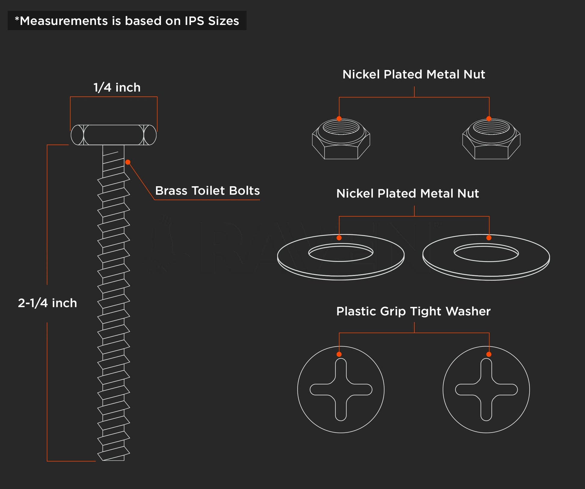 - Package Includes- 100 sets of 2 Brass-plated Toilet Bolts, 2 plastic Grip tight washers, 2 nickel plated metal nuts and 2 nickel plated washers.