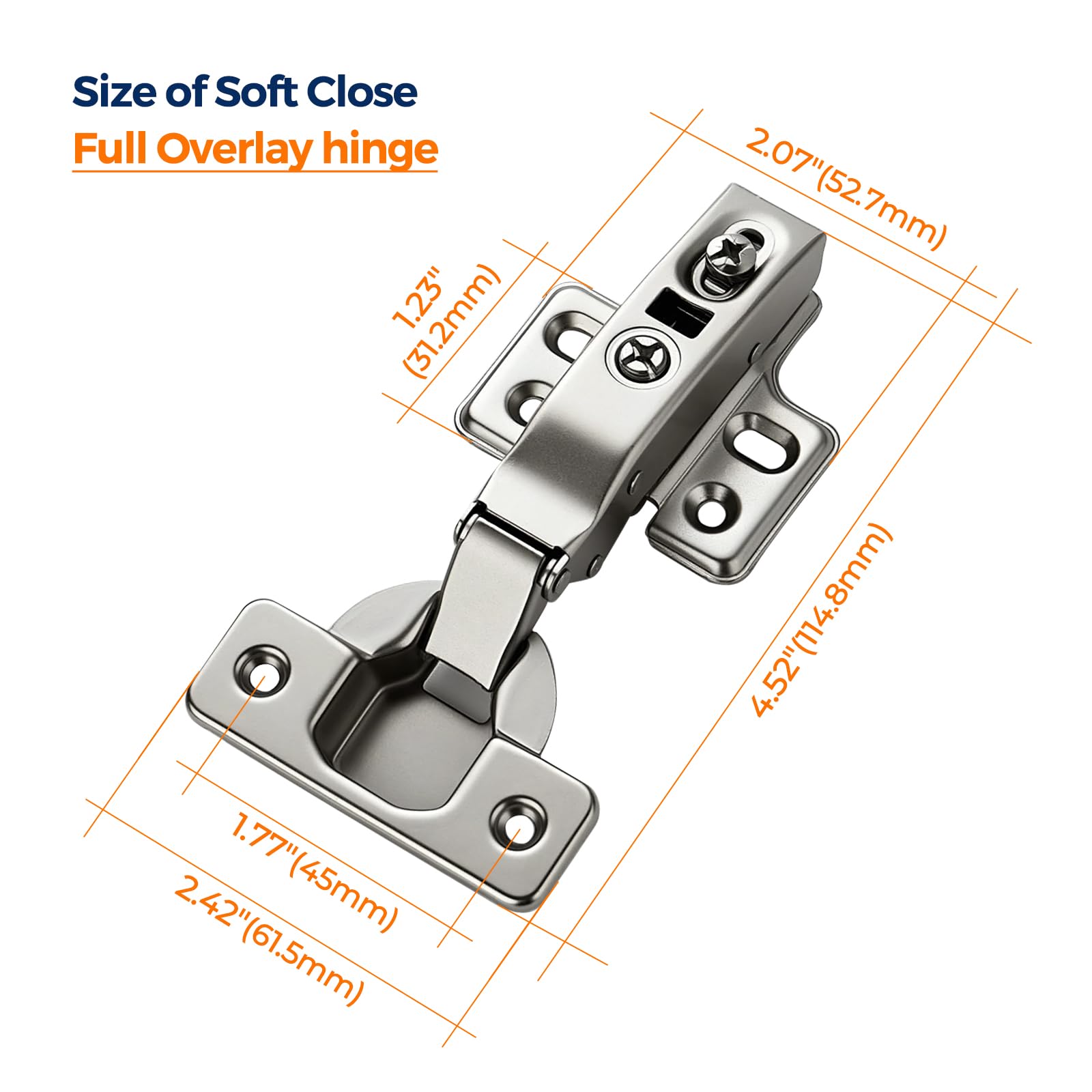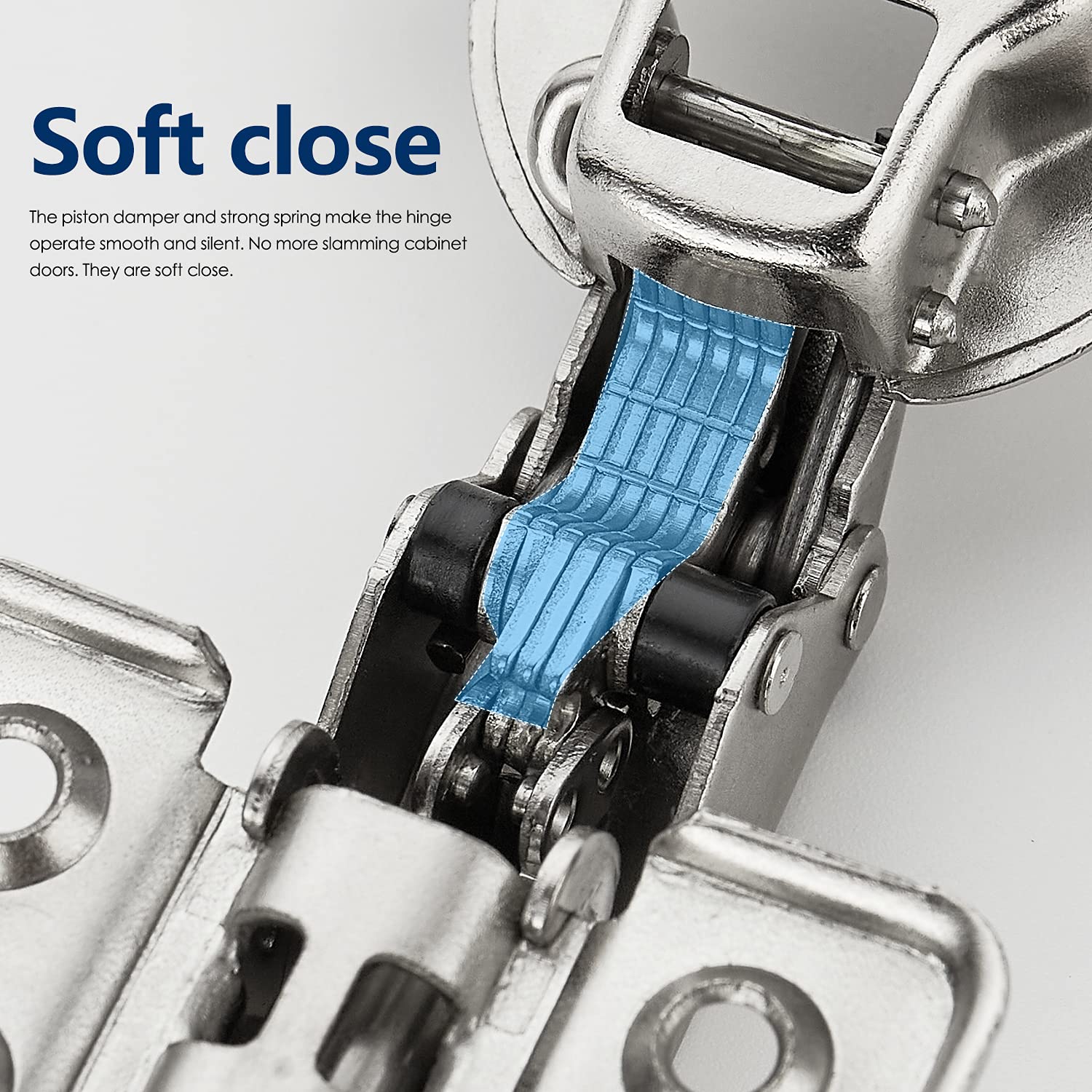 - Soft close: The piston damper and strong spring make the hinge operate smooth and silent. No more slamming cabinet doors. They are soft close.