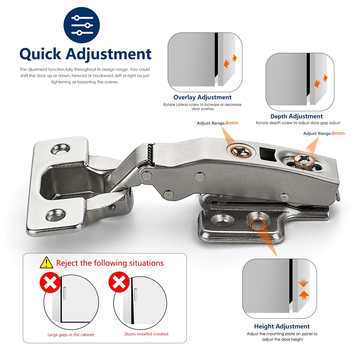 - Quick adjustment: The adjustment function fully throughout its design range. You could shift the door up or down, forward or backward, left or right by just tightening or loosening the screws.