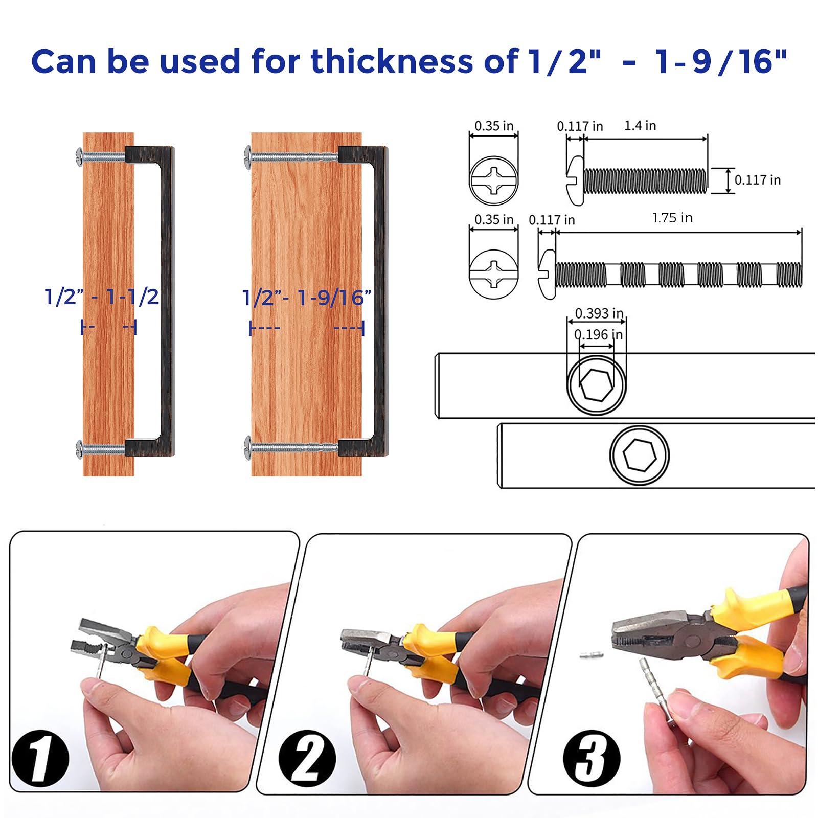- If you're replacing your handle, measure and ensure the center to center hole spacing of the current handle is 6-1/4 inches(160mm) Installing new cabinet handles, drill two holes with center to center spacing of 6-1/4 inches(160mm)