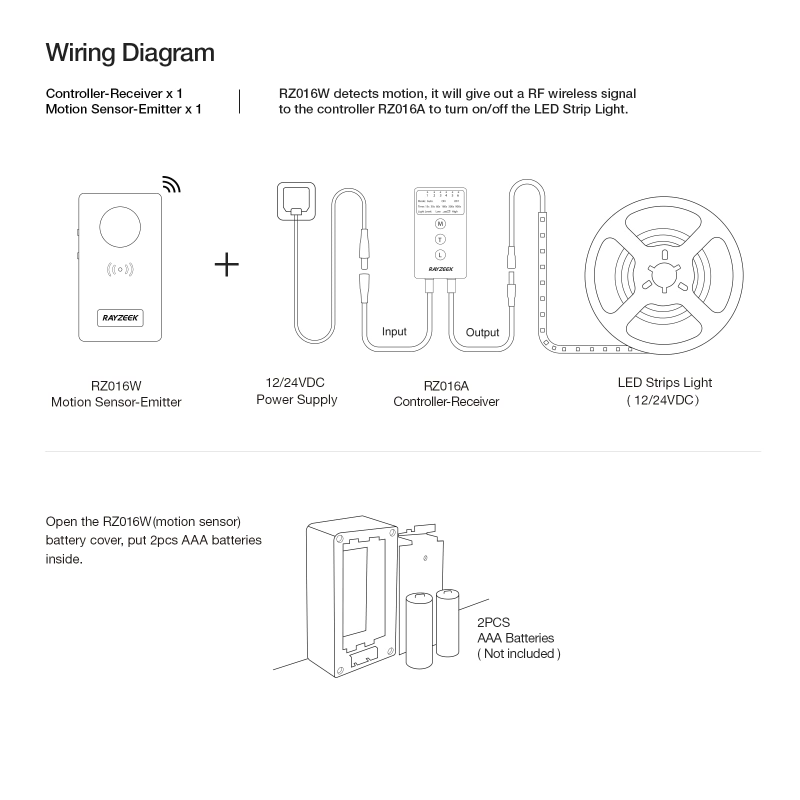 - 【Wireless Motion Sensor-Emitter RZ016W】It's a Motion sensor and a wireless emitter powered by 2pcs AAA(not included batteries).It can detect movement by detecting Infrared ray emitted by human body. When it detects motion, it will give out a RF signal to the main controller RZ016A to turn on/off the sensor.