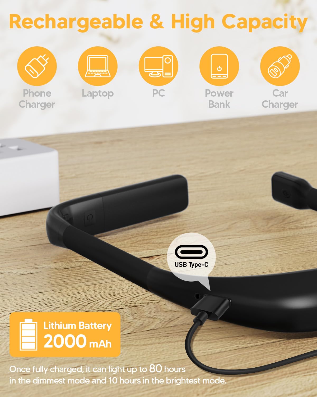 - Powerful 2000mAh Rechargeable Battery – Book light is used for Days, Not Hours: Fully charges in just 4 hours and delivers up to 10 hours at full brightness or 80 hours on low. If you read 30 minutes a day, one charge lasts nearly 20 DAYS. Whether you're a bookworm reading at night or using it as an emergency light during power outages, our neck lamp is ready anytime, anywhere. Saves up to 20x the energy of typical bedside lamps, more energy-efficient and eco-friendly