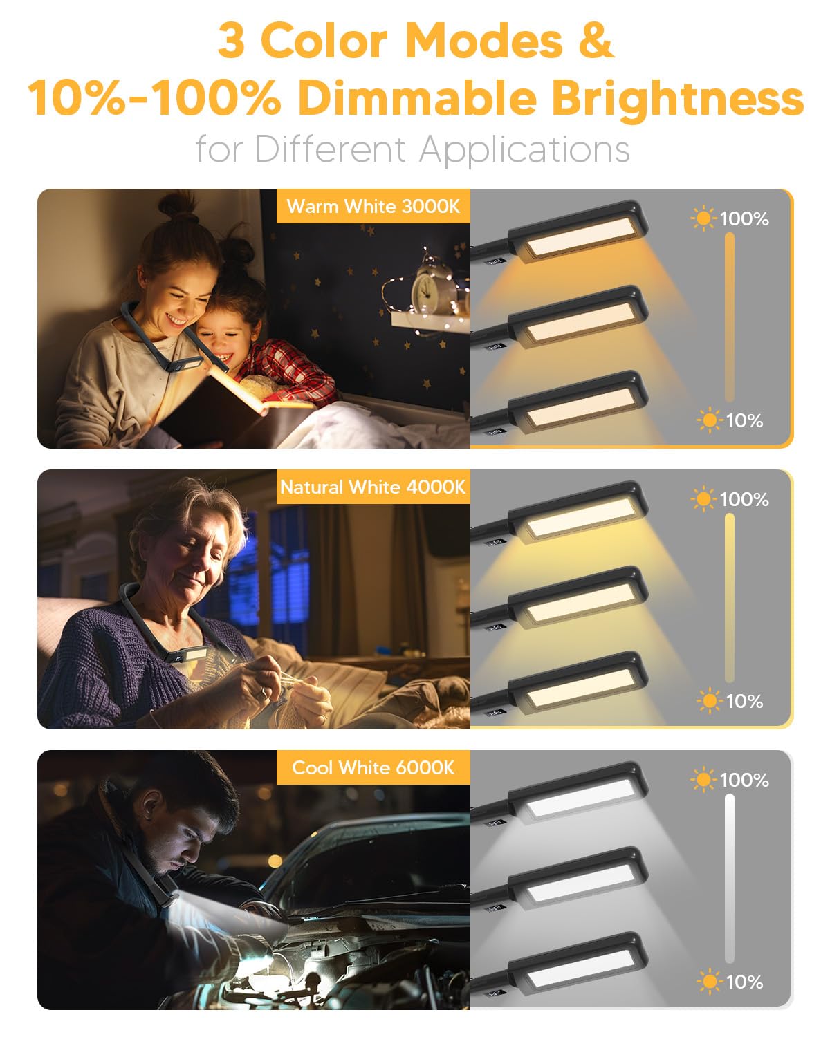 - Adjustable Light Modes & Brightness 100%-10%– Tailored for Every Task: Customize warm light, natural light, or cool white light to suit different tasks—whether it's knitting in the living room, cross-stitching in your studio, or reading in a tent. You can switch modes with a single click. Press and hold the same button to adjust brightness from 100% down to 10%. The flexible arms and patented 180° rotatable light heads allow you to direct the light exactly where you need it