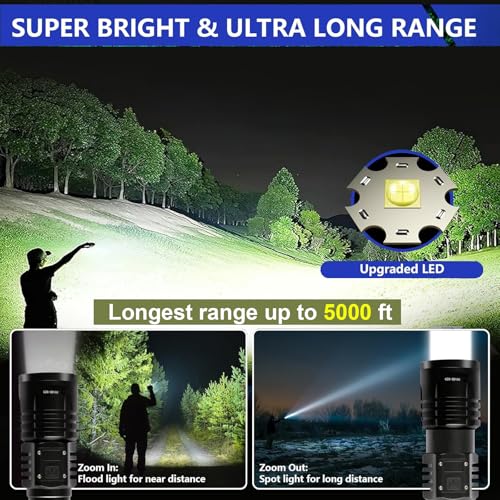 - [???????? ???????????? ?????????????????????? ????????????????????????]This 5000mAh large capacity battery rechargeable high-lumen flashlight is a powerful and reliable tool for a variety of lighting needs.With brightness of up to 1000000 lumens and a long-distance beam range of 5000 feet, it¡¯s perfect for outdoor adventures,emergencies, or professional use. while the USB-C charging ensures convenience and fast recharging. A must-have for anyone needing a super-bright, long-lasting flashlight.
