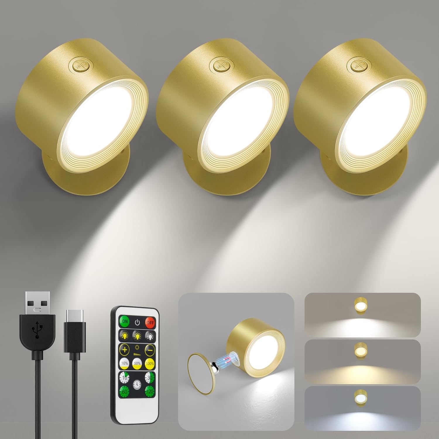 Rechargeable LED Wall Mounted Lights - 3 Pack with Remote, Dimmable & 360° Rotation for Bedroom