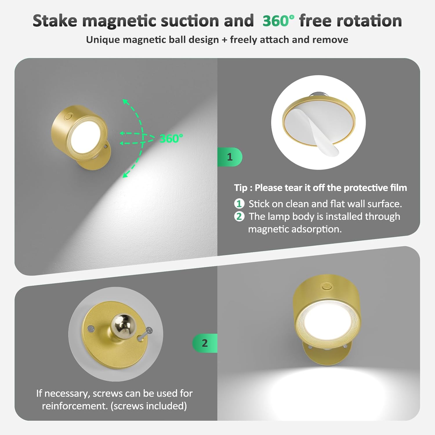 - 360° Free Rotations Magnetic Ball. This bedside lamp use magnetic technology. The lamp body and lamp holder are adsorbed by a magnetic iron ball, so the lamp body can rotate at any angle. You can take it off the wall in 1s and use it as flashlight, removable light, portable light, emergency light etc. Adjust any angle according to your usage scenario.