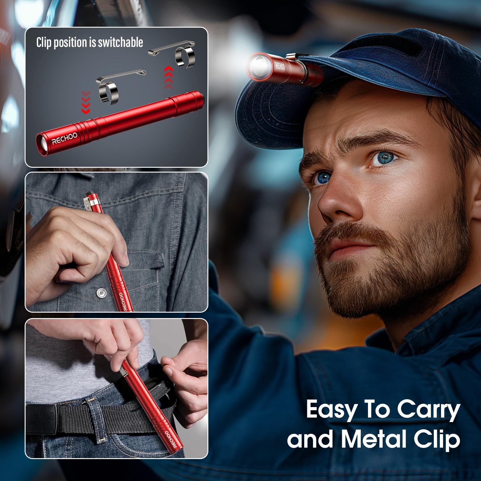 - Potable & Lightweight Pen Flashlight: Extremely compact, only 5.2 inches long and weighs only 0.06 lbs; Comes with a removable clip, making these small flashlights easy to put in your pocket or bag, and clip them to a belt, hat, and notebooks freeing up your hands for easy carrying