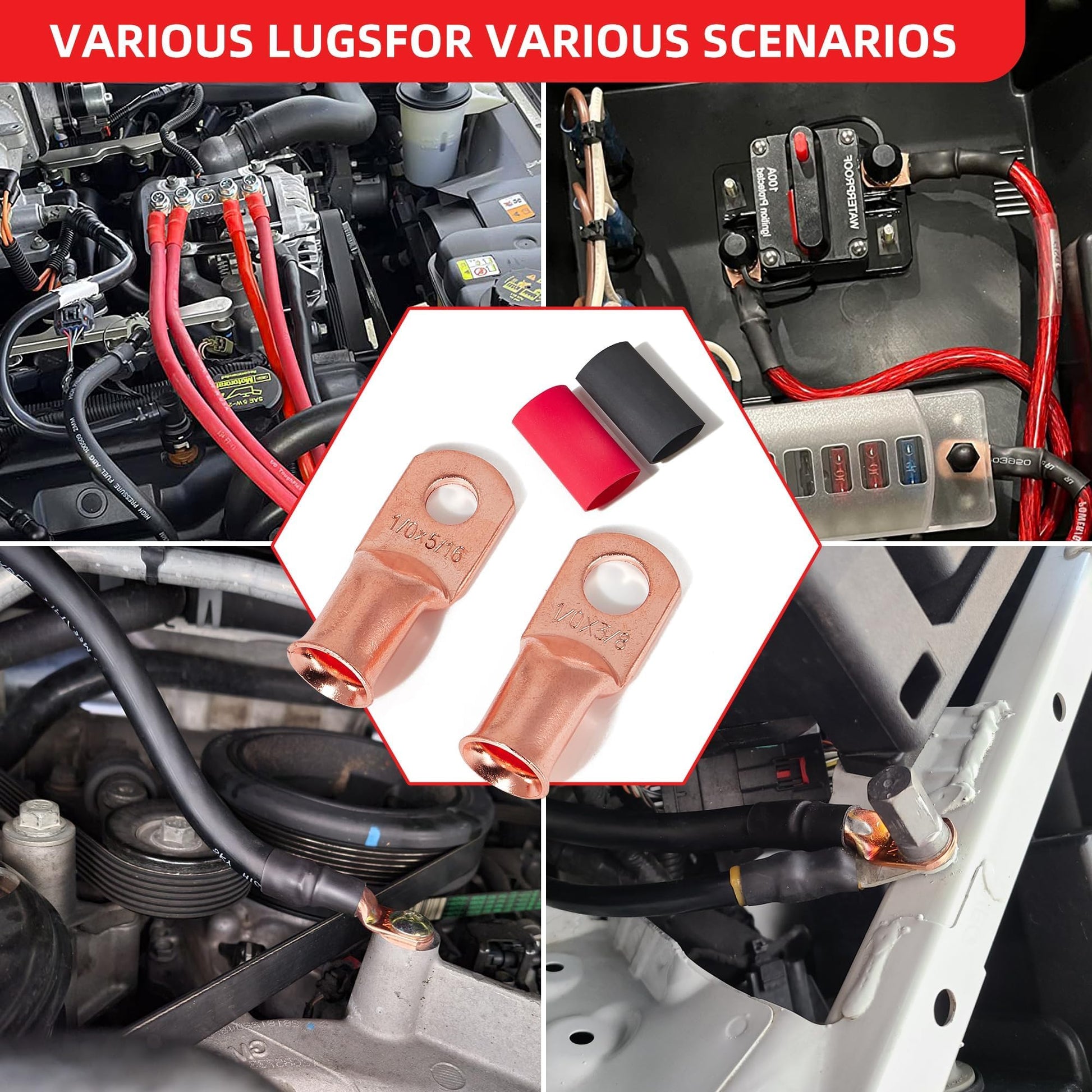 - WHAT YOU GET: 10 PCS per pack of 8 AWG 3/8" wire lugs copper cable lugs, with 10 pieces of 3:1 ratio dual wall adhesive heat shrink tubing (5 black and 5 red) for meeting your different needs