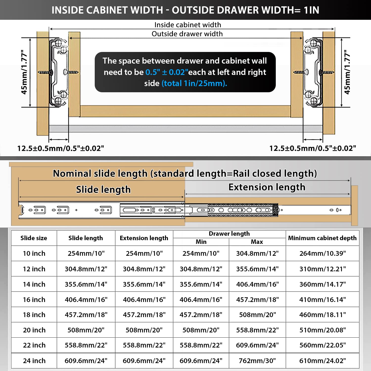 - 【installation notes】 Choose the size of the rails according to the depth of the drawer,the length of drawer≥length of slides,the tolerance 0”-1”/25mm is okay. The slides is side mounted,the space between drawer and cabinet wall need to be 12.5mm/0.5in each side(total 25mm/1in). One set includes a pair of slides with mounting screws included.