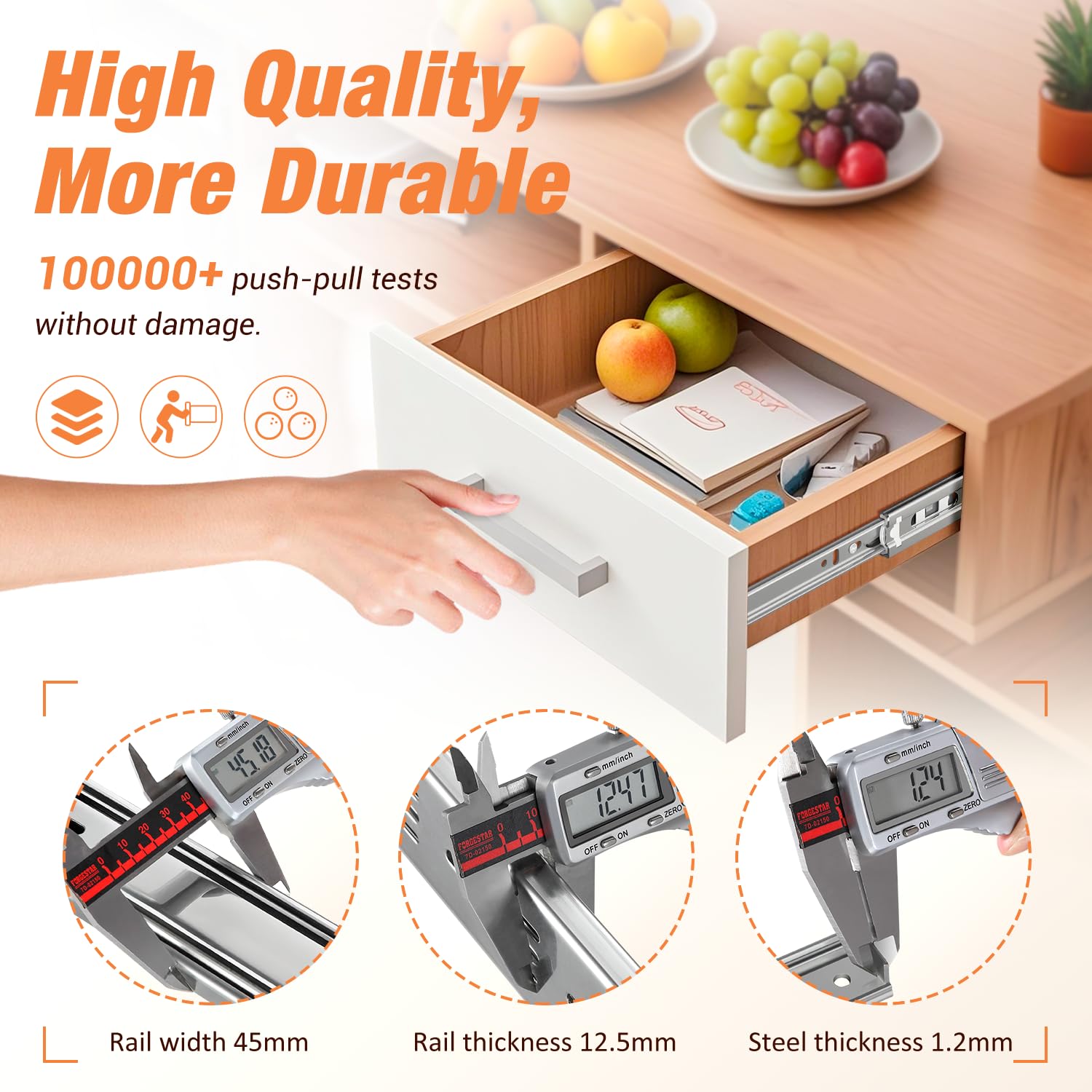 - 【High quality, more durable】 The drawer slides is made of 1.2mm thickness high quality cold rolled steel and industrial solid steel ball,which take 100,000 times push-pull tests without damage. The maximum load weight is up to 100lbs. REGUDA is committed to produce sturdy and durable drawer slides .Besides the quality,we also focused on after-sales service,any quality or installing problem please feel free to contact us.