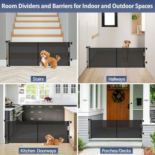- Indoor/Outdoor Use ? Waterproof and Rustproof: This small retractable pet gate is perfect for blocking off areas like hallways, staircases, doorways, kitchens, and outdoor spaces. It can also serve as a room divider.