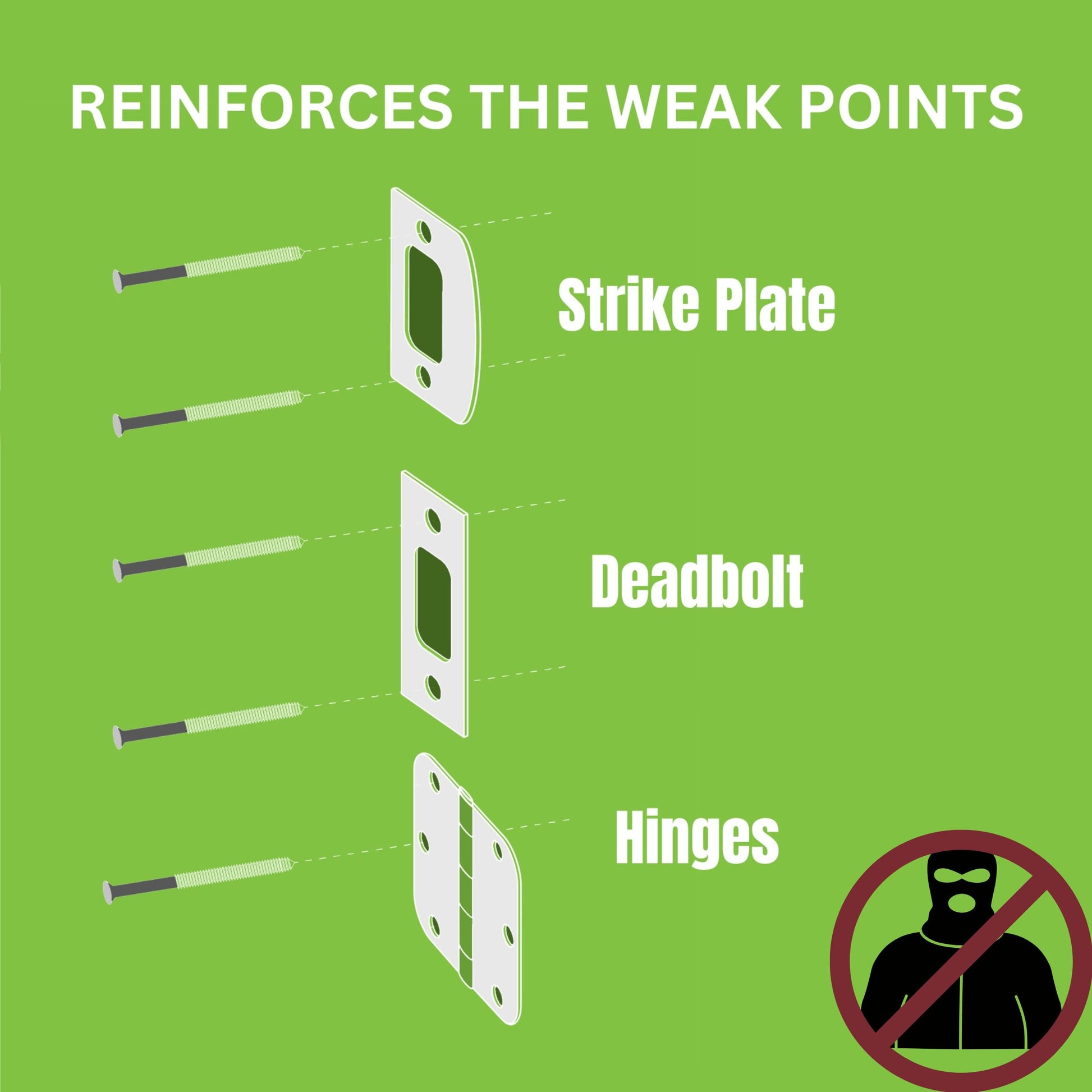 - [ANTI-VILLIAN TECHNOLOGY] Fixes the 3 WEAK POINTS of a residential door: The Strike Plate, Deadbolt Plate, and Hinges. Kick resistant doors for Homes or Apartments. Security in an unpredictable world.