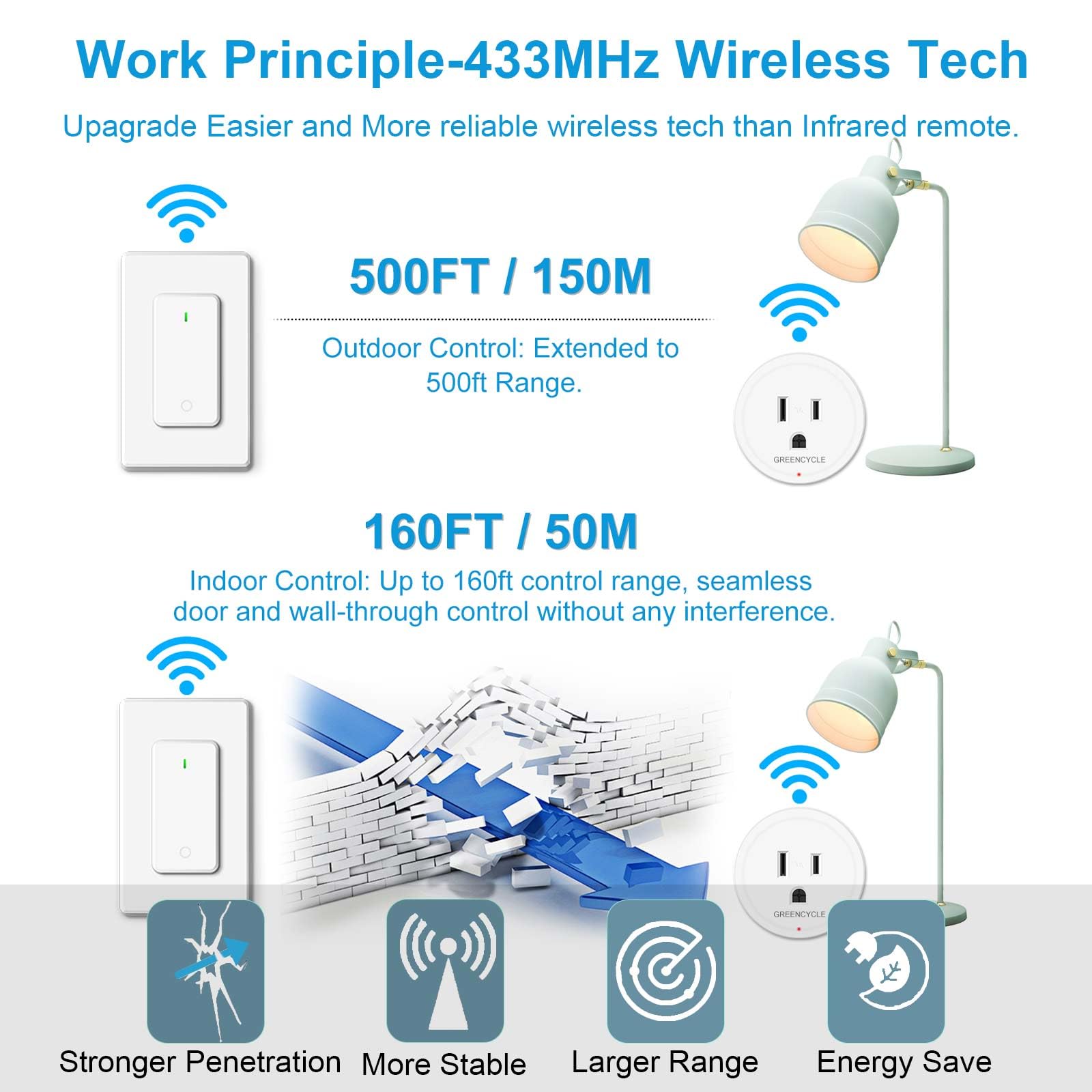 - 【✅500ft/150m Large RF Range Control】Control Range: 160-500feet, regardless of obstacles. Enjoy seamless door and wall-through control without any interference from other electronics. WiFi-free, you can rest assured about signal issues. Conveniently remote control outlet switch from any corner of your home,enhancing your lifestyle with efficiency.