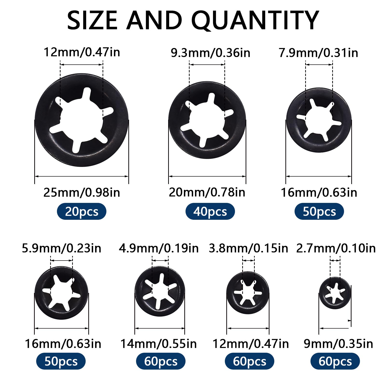 - Multiple Sizes: The size of star locking washer is M3-9mm, M4-12mm, M5-14mm, M6-16mm, M8-18mm, M10-20mm, M12-25mm (diameter). Sufficient to handle all kinds of situations.