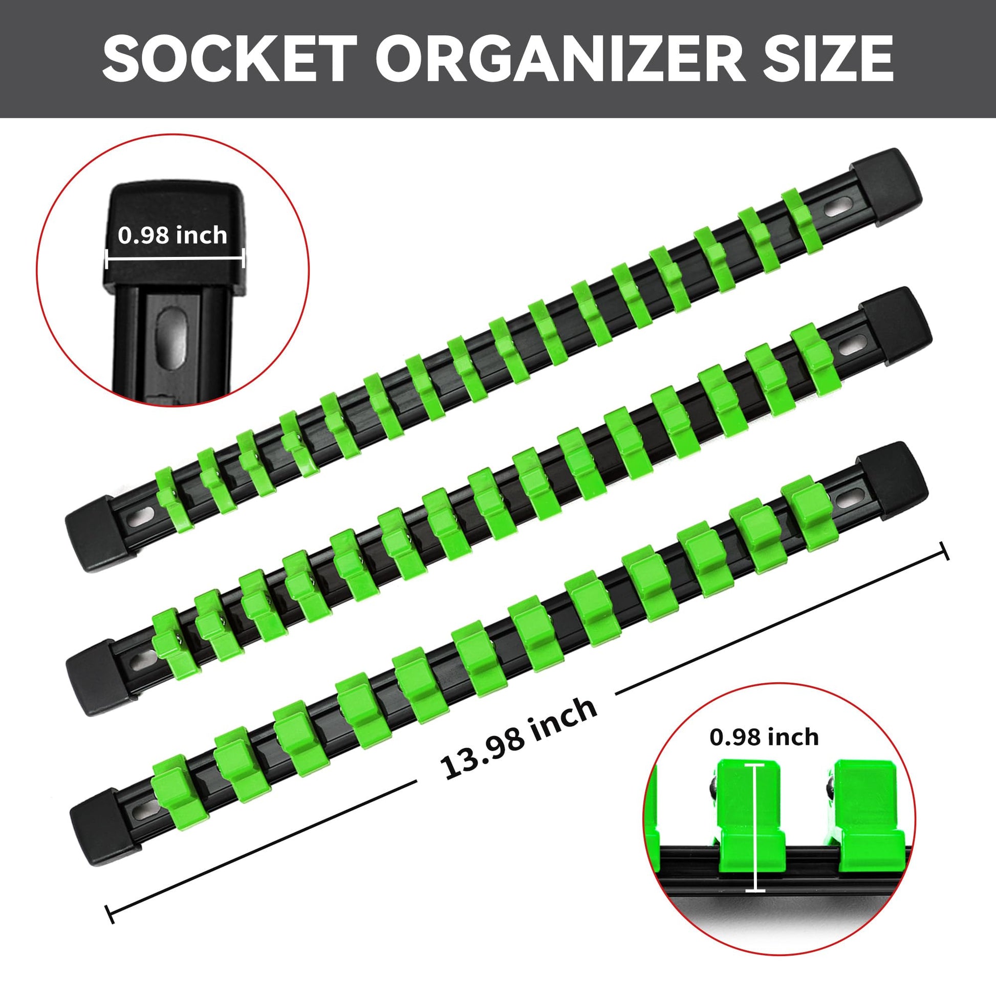 - Large Capacity: We have introduced a single green color to facilitate your needs, holding up to 430 sockets. The socket organizer comes with clips in sizes of 1/4" x 160, 3/8" x 150, and 1/2" x 120.