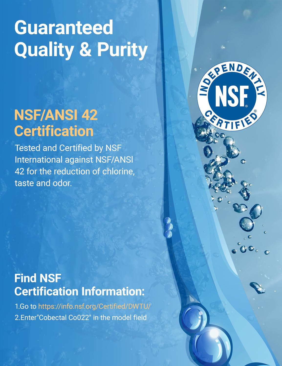 - PURE WATER,SAFE AND RELIABLE - NSF 42 guard. Cobectal replacement water filter can efficiently remove harmful contaminants and chemicals as well as the unpleasant taste and odor associated with chlorine.Top grade coconut shell activated carbon Certified will make your families enjoy safe and pure drinking water