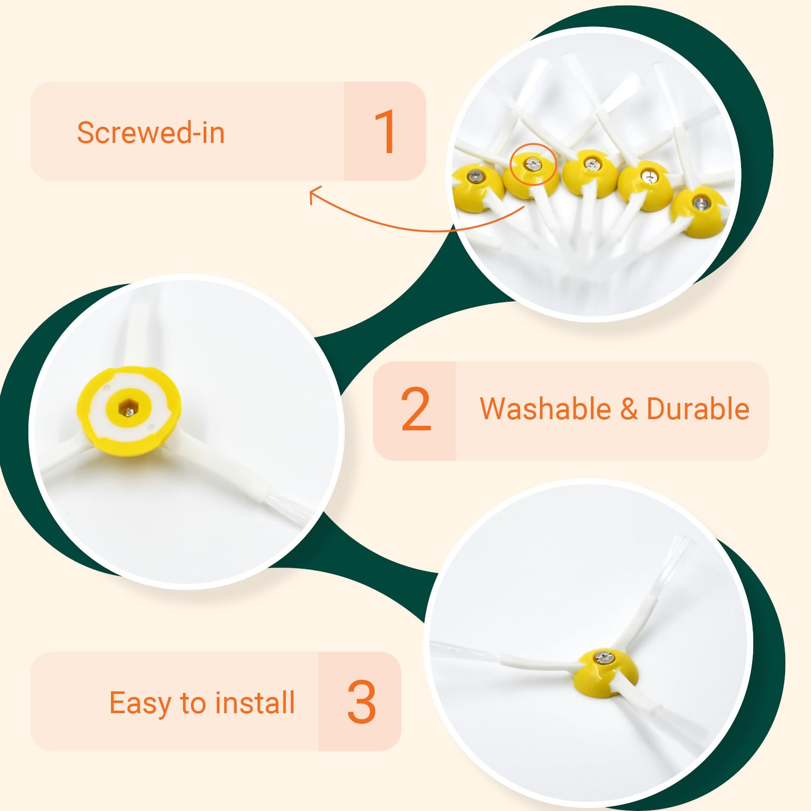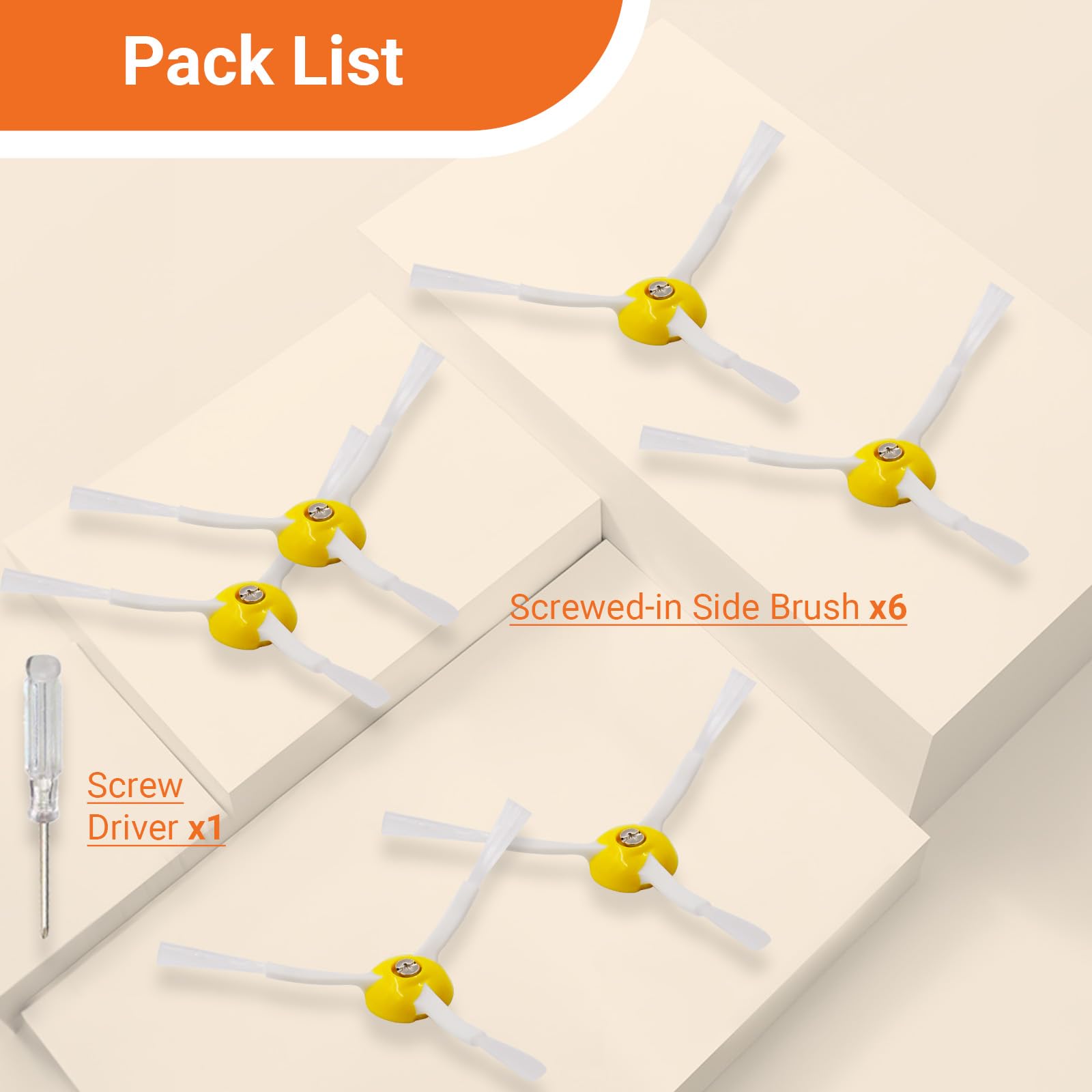 - Value package:Inside the packaging box, there will be 6 x yellow screw in side brushes,1 x screw driver.If the side brush bends during transportation, it can be restored by soaking it in warm water for a while