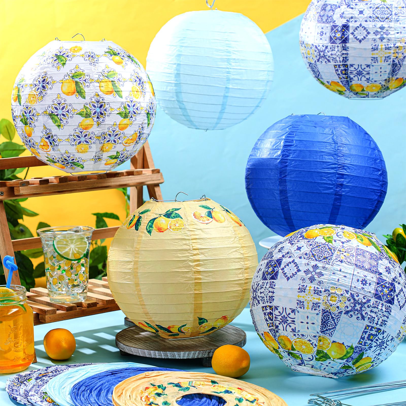 Retisee 12 Pcs 10'' Capri Lemon Pattern Paper Lantern Party Supplies for Bridal Shower Wedding Amalfi Coast Blue Yellow Tiles Mediterranean Party Paper Lantern Hanging Decor for Lemon Birthday