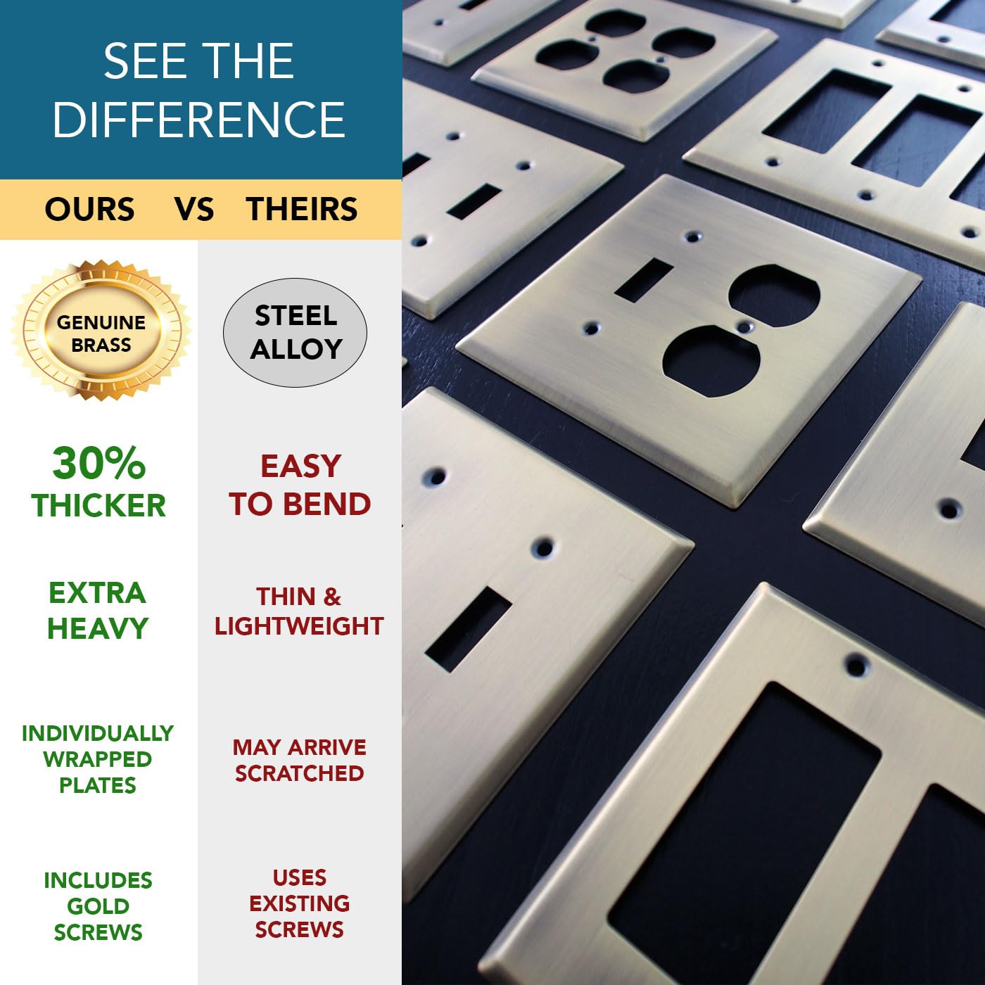 - Matching Hardware Included : Each set comes with matching gold hardware screws for your wall plate. The brushed polished brass outlet guard will protect your socket and electrical outlet with a decorative modern look sure to grab attention. Our plug covers for electrical outlets are industrial strength and corrosion resistant.