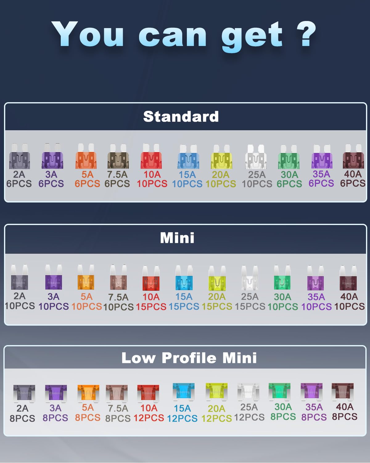 - All Sizes You Need - Car fuse kit include 82 pcs of standard size, 130 pcs of mini size and 104 pcs of LP size. Each of the three models of auto fuse is available in 11 current size (2A / 3A / 5A / 7.5A / 10A / 15A / 20A / 25A / 30A / 35A / 40A) and comes with 1 fuse puller.