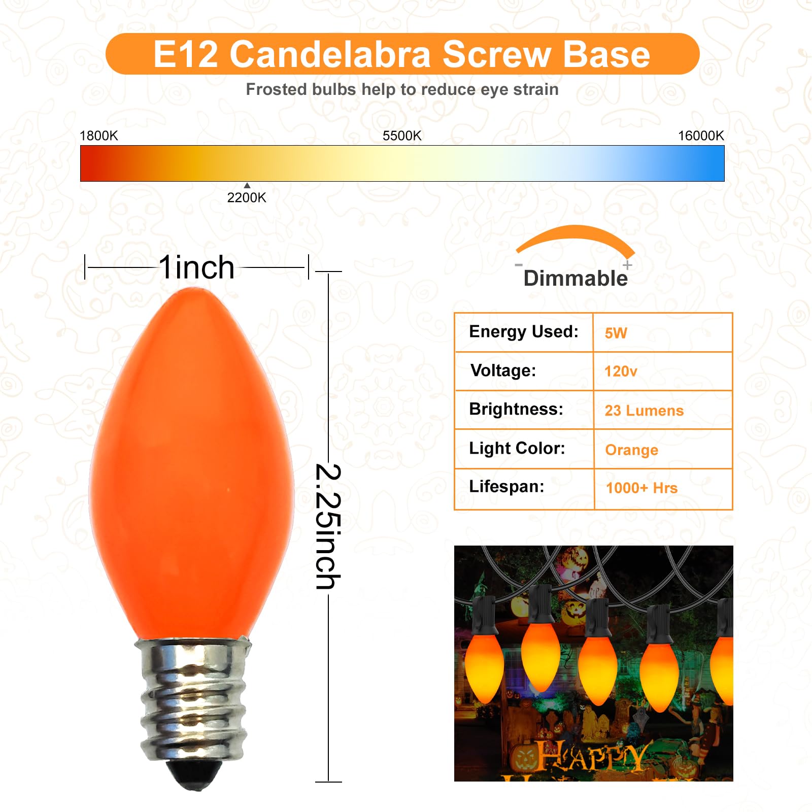 - C7 Ceramic Orange Bulbs: Perfect for Halloween decorations or adding a festive touch to any occasion. These 25 pack 5W C7 Orange bulbs have a color temperature of 2200K. They are well packed to prevent breakage during shipping. Whether you’re decorating for a party, holiday, or just want to add a pop of color to your space, these C7 Orange bulbs are a great choice
