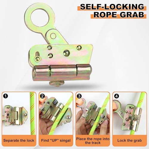 - ¡¼ALLOY STEEL ROPE GRAB & SNAP HOOKS¡½: The Safety harness roofing rope comes with two steel snap hooks , double locking screw mechanism and locking clips , adding double security to your working environment. Spring switch design & strength lock switch on two sides allows workers to better use the rope while working, and are self-locking with minimal tensile break strength of 5,000 lb. The rope grab hook is adjustable, allowing you to easily move along the life rope.