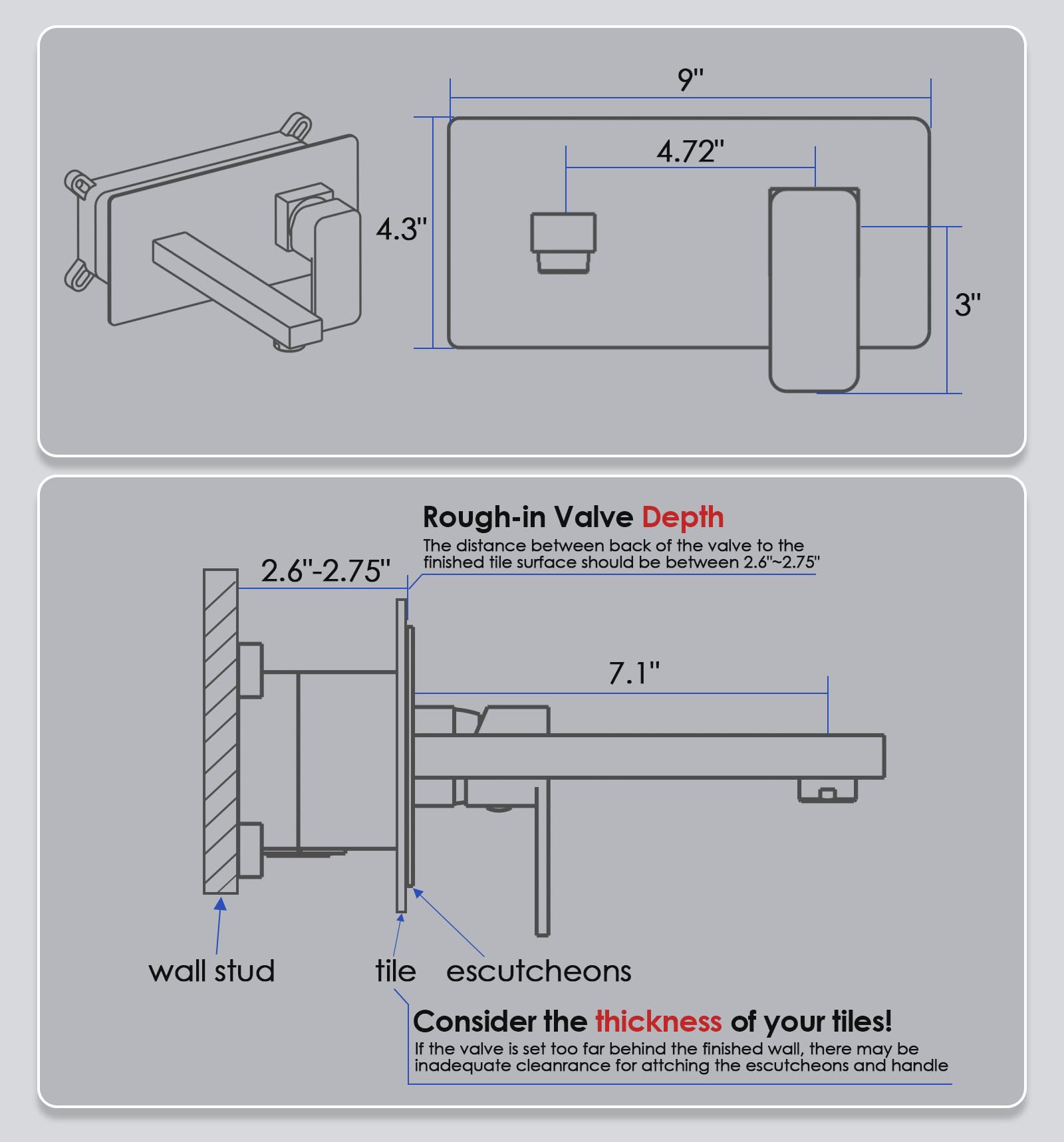 10. Rough-in Valve Depth: 2.6"~2.75" (The distance between the back of the valve to the finished tile surface must be between 2.6"~2.75").