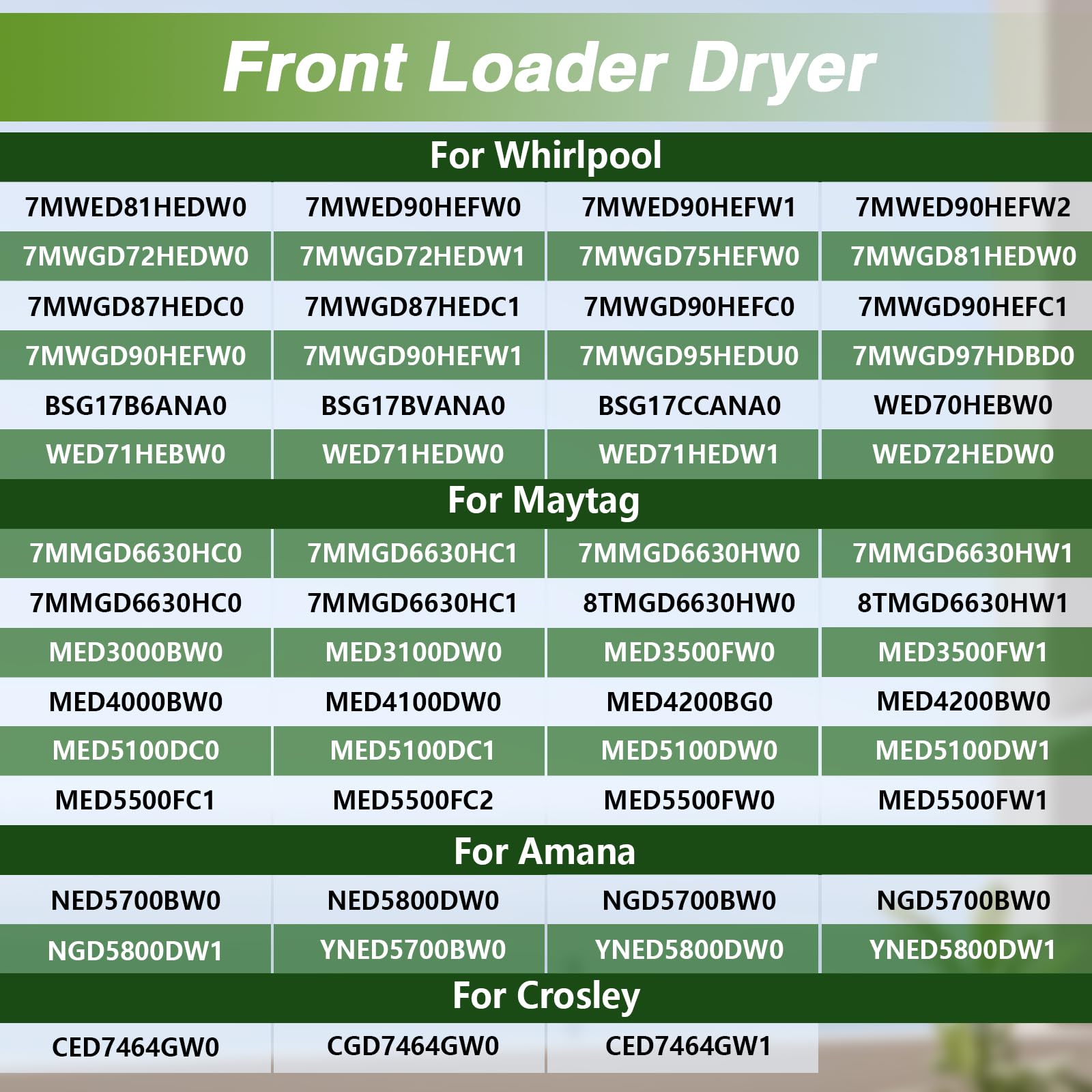 - 【Compatible with】: Front Loader Dryer: BSG17BVANA0, BSG17CCANA0, WED70HEBW0, WED71HEBW0, WED7540FW1, WED85HEFW1, WED85HEFW2, WGD92HEFC1, WGD92HEFU0, WGD92HEFU1, WGD92HEFW0, WGD92HEFW0, WGD94HEAC0, WGD94HEAC1, WGD94HEAC2, WGD94HEAW0, WGD94HEAW1, WGD94HEAW2, CED7464GW0, CGD7464GW0, CED7464GW1, MED3000BW0, MED3100DW0, MED3500FW0, MED3500FW1, MED4000BW0, MED4100DW0, MED4200BG0, MED4200BW0, MED5100DC0, MED5100DC1, MED5100DW0, MED5100DW1, MED5500FC1, MED5500FC2, MED5500FW0, MED5500FW1, MED7000AG0, MED7000AW0, MED7000XG0, MED7000XG1, MED7000XG2, NED5700BW0, NED5800DW0, NGD5700BW0, NGD5800DW1, YNED5700BW0, YNED5800DW0, YNED5800DW1, YNED5800DW2